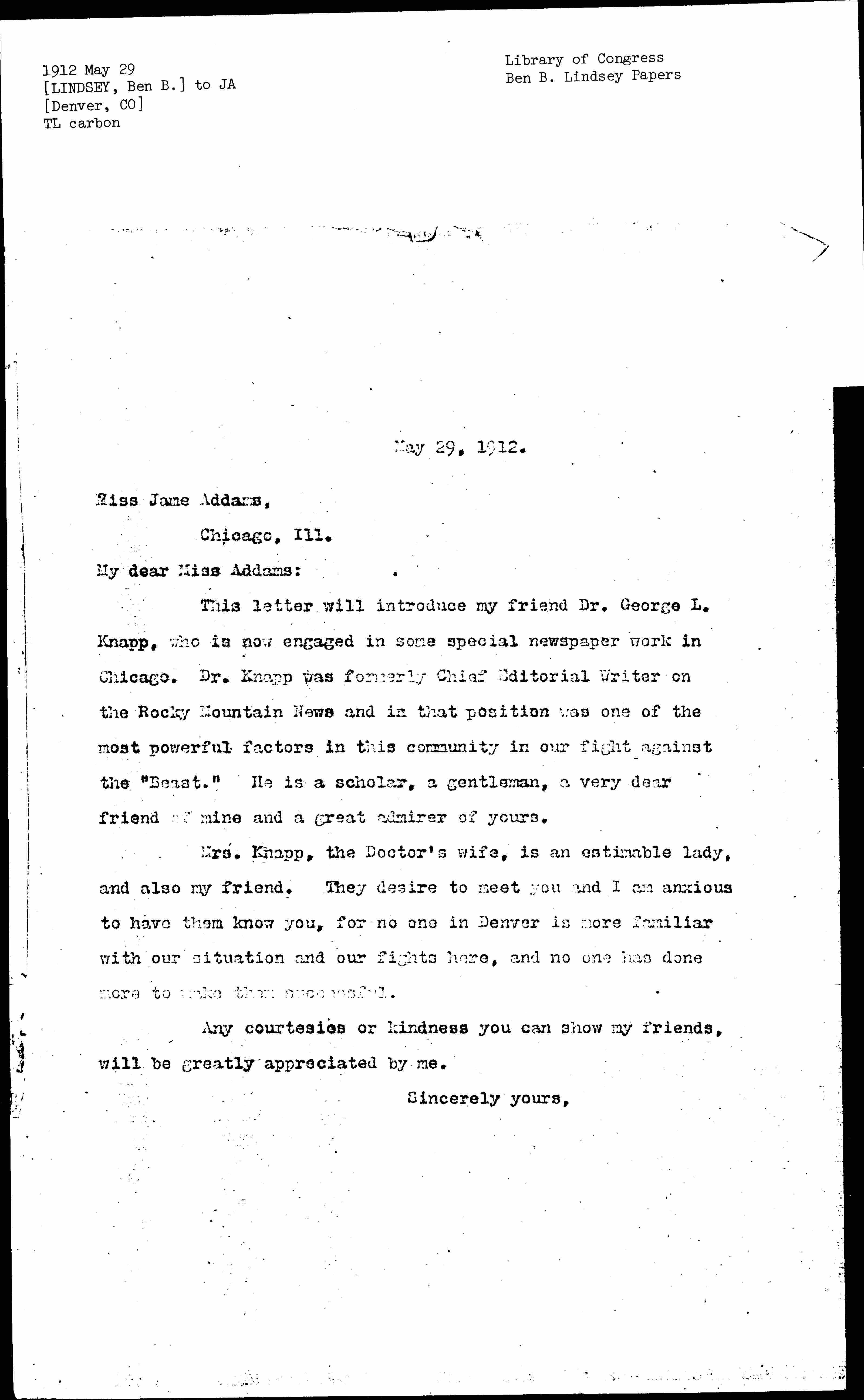 This letter will introduce my friend Dr. George L. Knapp, who is now engaged in some special newspaper work in Chicago. Dr. Knapp was formerly Chief Editorial Writer on the Rocky Mountain News and in that position was one of the most powerful factors in this community in our fight against the "Beast." He is a scholar, a gentlemen, a very dear friend of mine and a great admirer of yours.