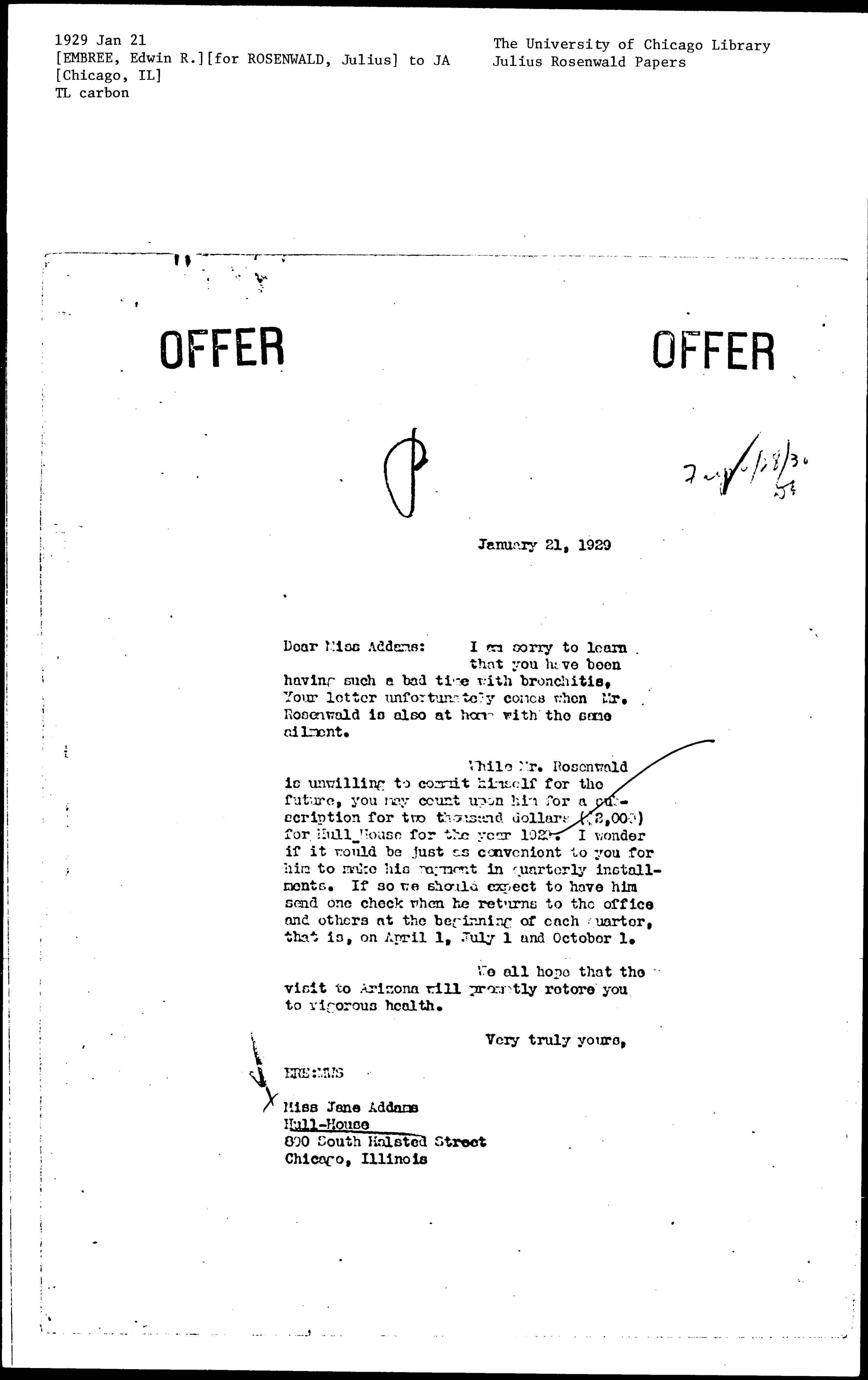 Edwin Rogers Embree to Jane Addams, January 21, 1929