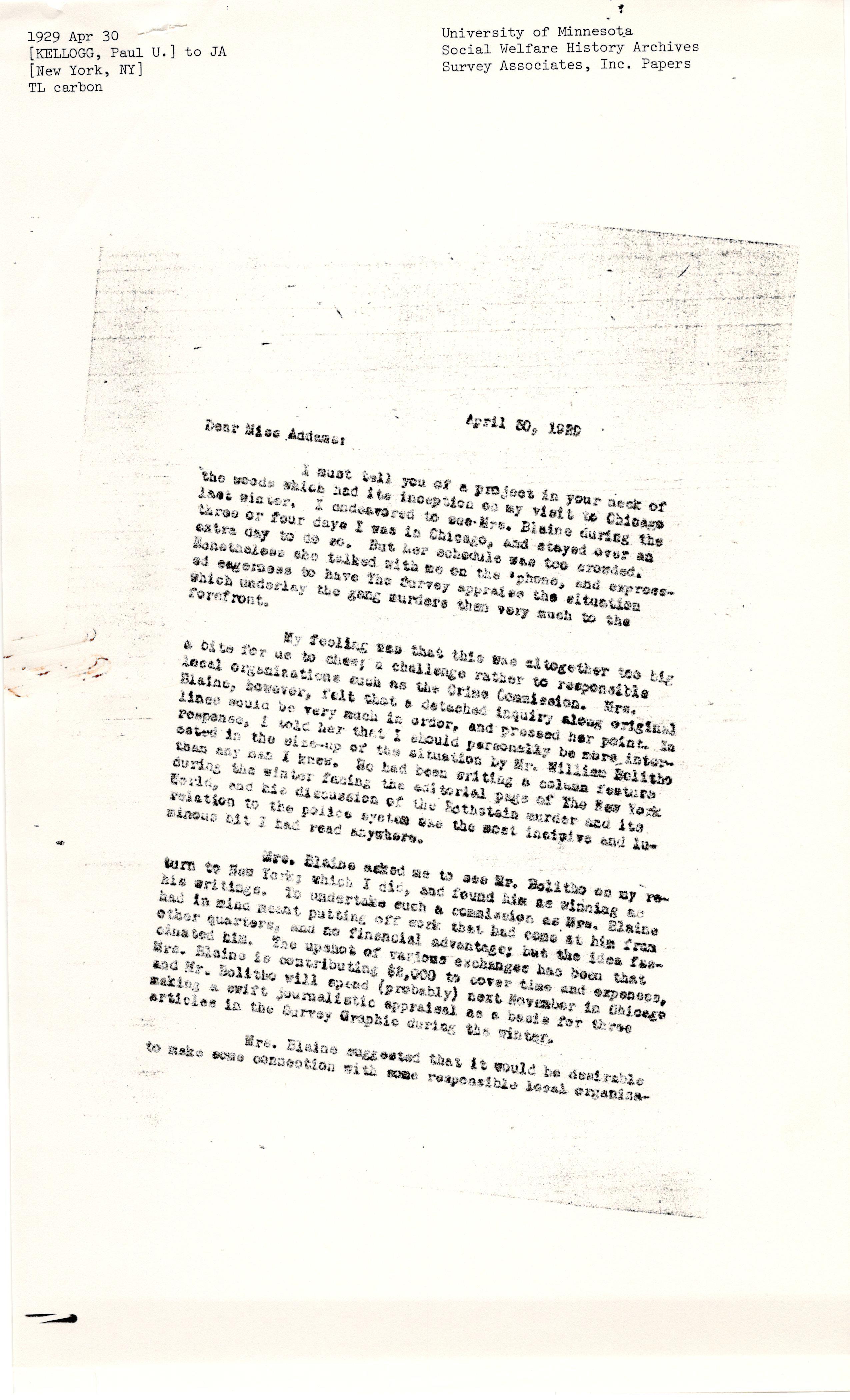 Paul Underwood Kellogg to Jane Addams, April 30, 1929