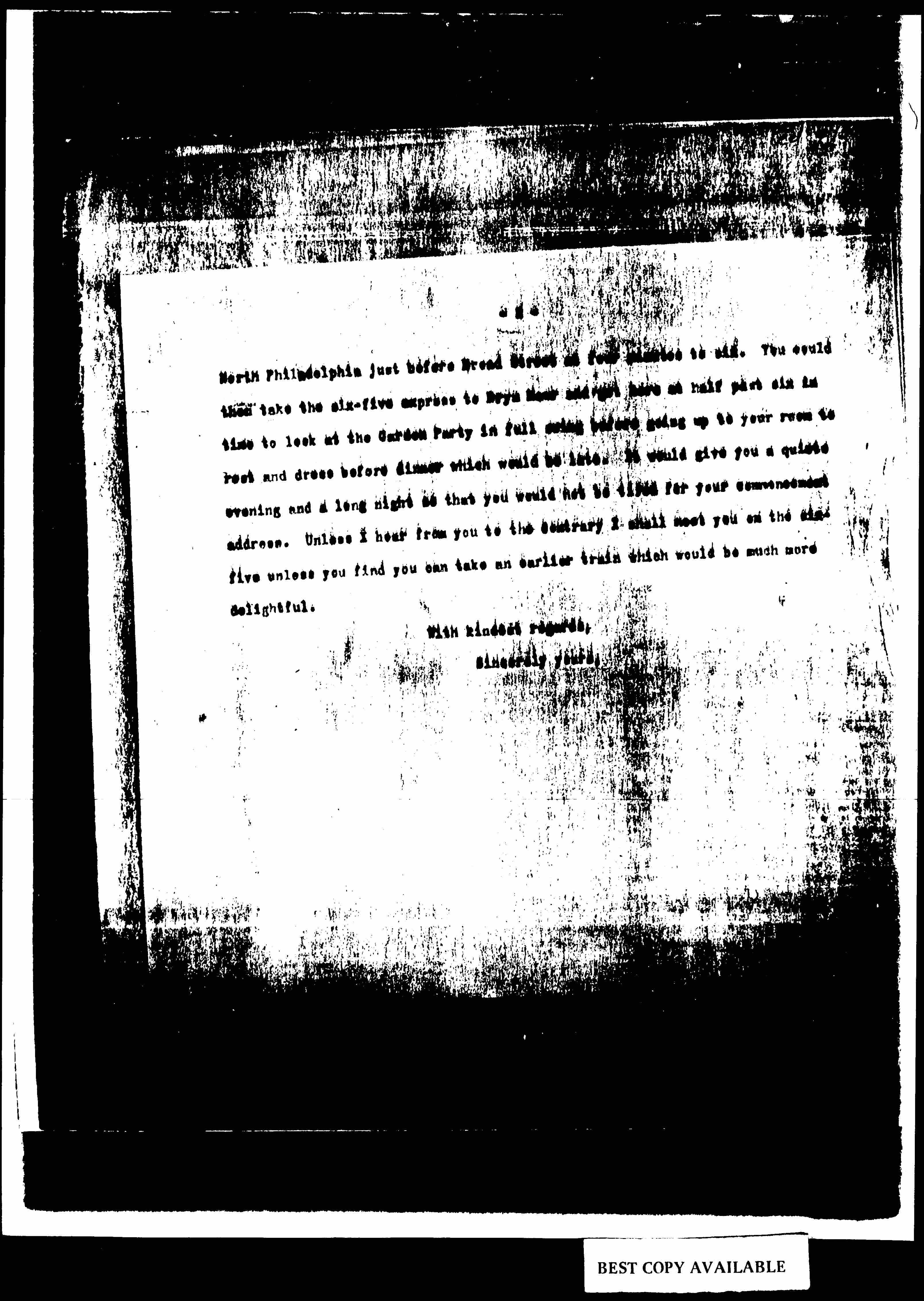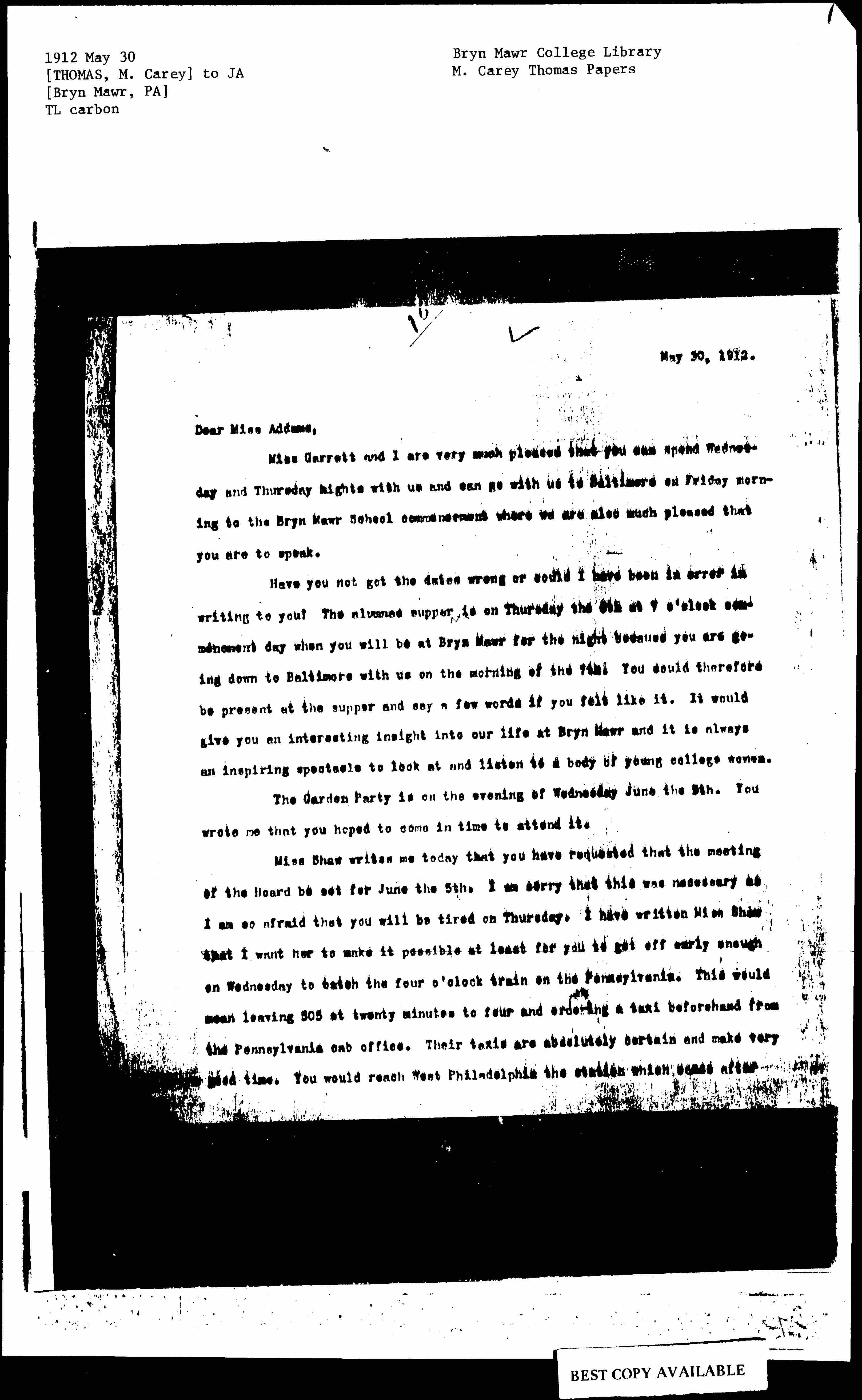 Miss Shaw writes me today that you have requested that the meeting of the Board be set for June the 5th. I am sorry that this was necessary as I am so afraid that you will be tired on Thursday. I have written Miss Shaw that I want her to make it possible at least for you to get off early enough on Wednesday to catch the four o'clock train on the Pennsylvania. This would mean leaving [505] at twenty minutes to four and ordering a taxi beforehand from the Pennsylvania cab office. Their taxis are absolutely certain and make very good time. You would reach West Philadelphia the station which comes after [page 2] North Philadelphia just before Broad Street at four minutes to six. You could then take the six-five express to Bryn Mawr and get here at half past six in time to look at the Garden Party in full swing before going up to your room to rest and dress before dinner which would be late. It would give you a quiet evening and a long night so that you would not be tired for your commencement address. Unless I hear from you to the contrary I shall meet you on the six-five unless you find you can take an earlier train which would be much more delightful.