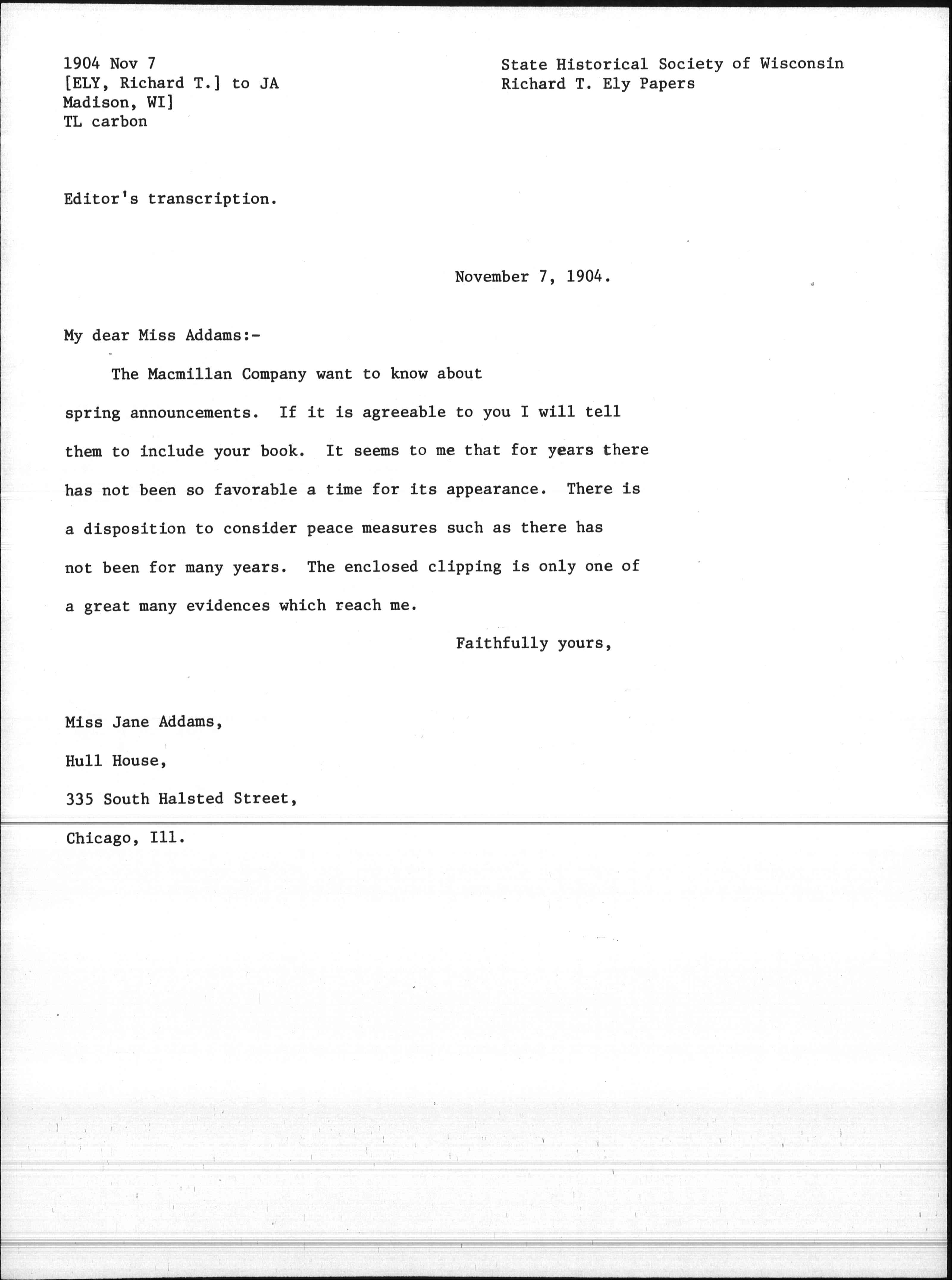 The Macmillan Company want to know about spring announcements. If it is agreeable to you I will tell them to include your book. It seems to me that for years there has not been so favorable a time for its appearance. There is a disposition to consider peace measures such as there has not been for many years. The enclosed clipping is only one of a great many evidences which reach me.