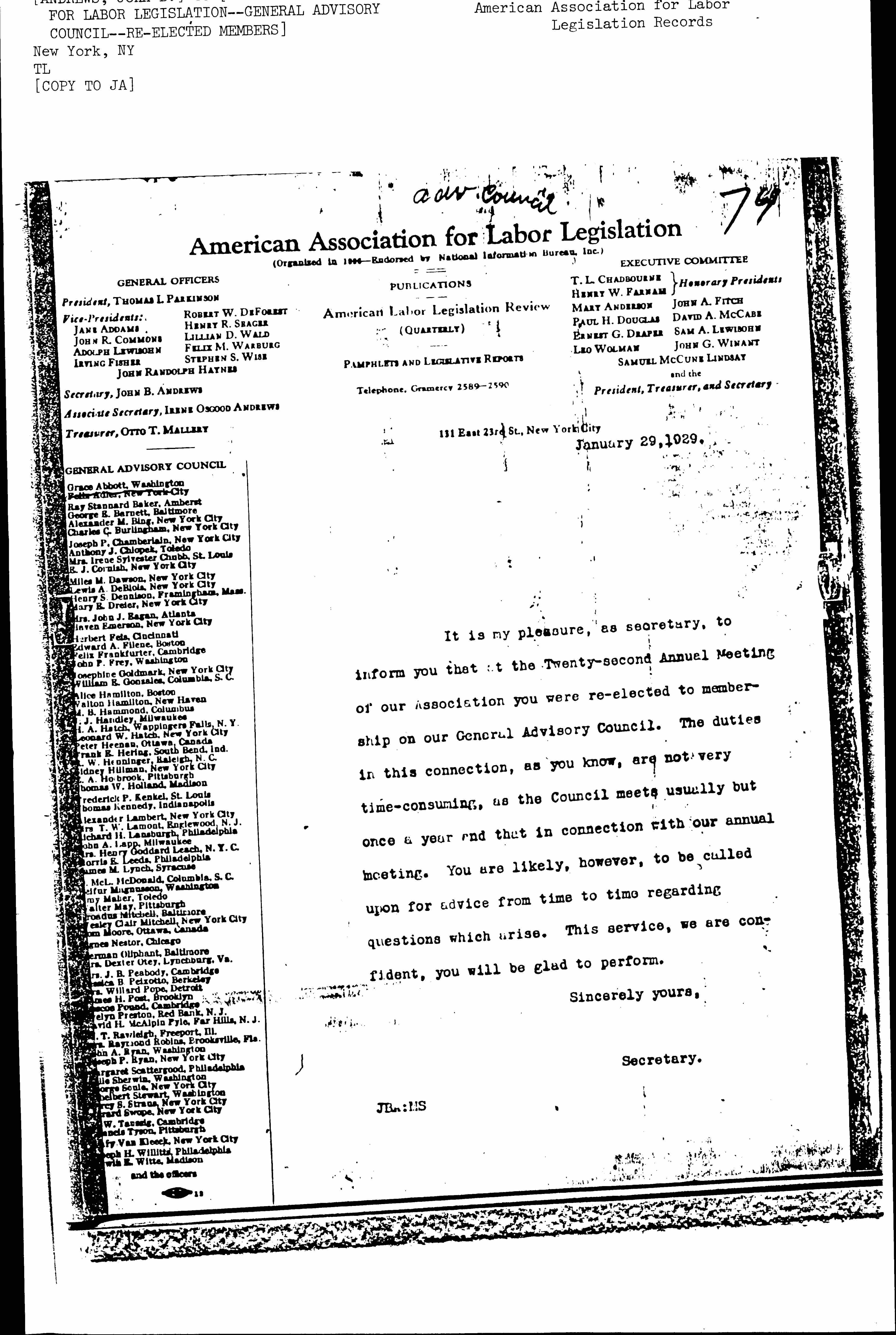 John Bertram Andrews to Jane Addams, January 29, 1929