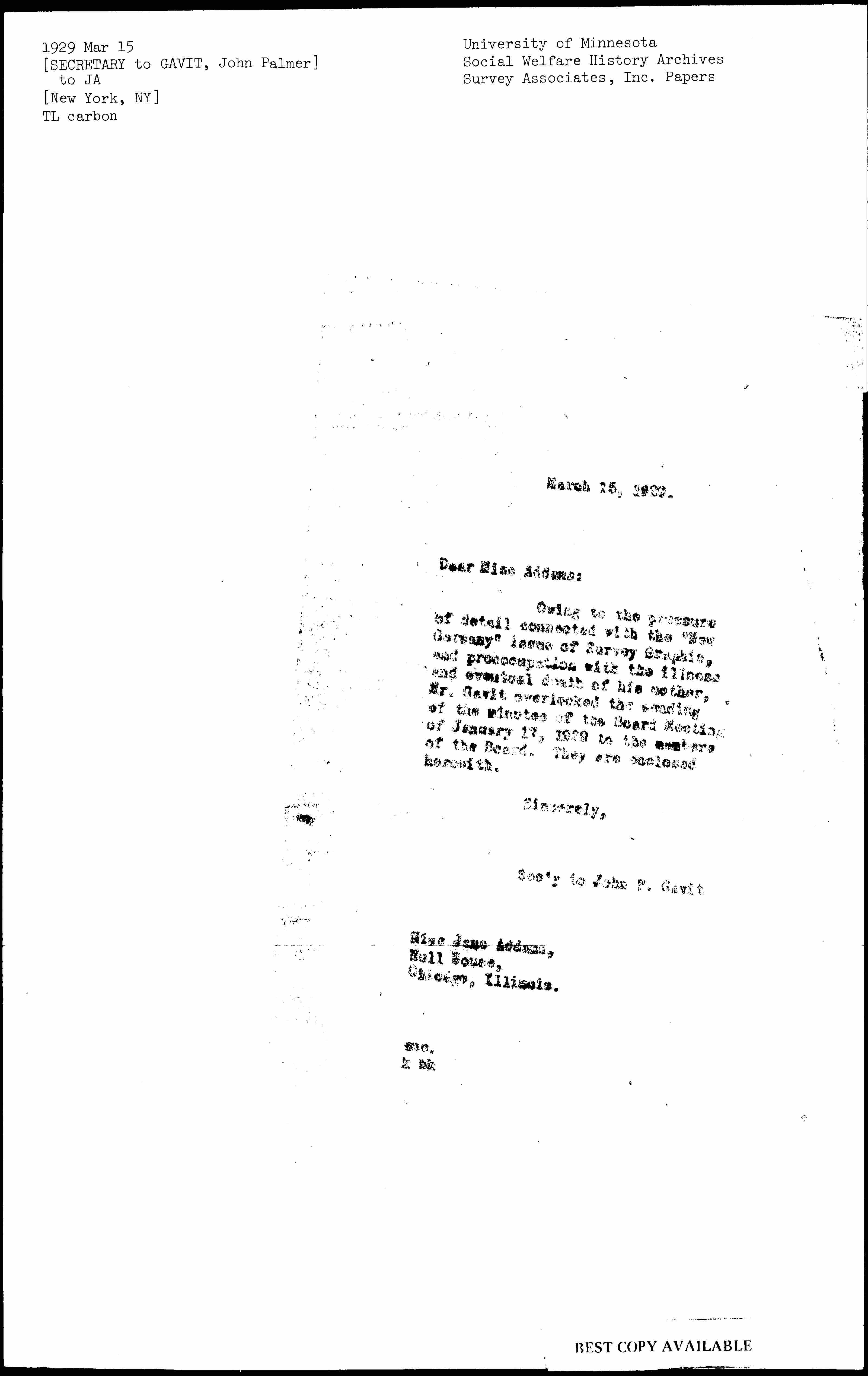 John Palmer Gavit to Jane Addams, March 15, 1929