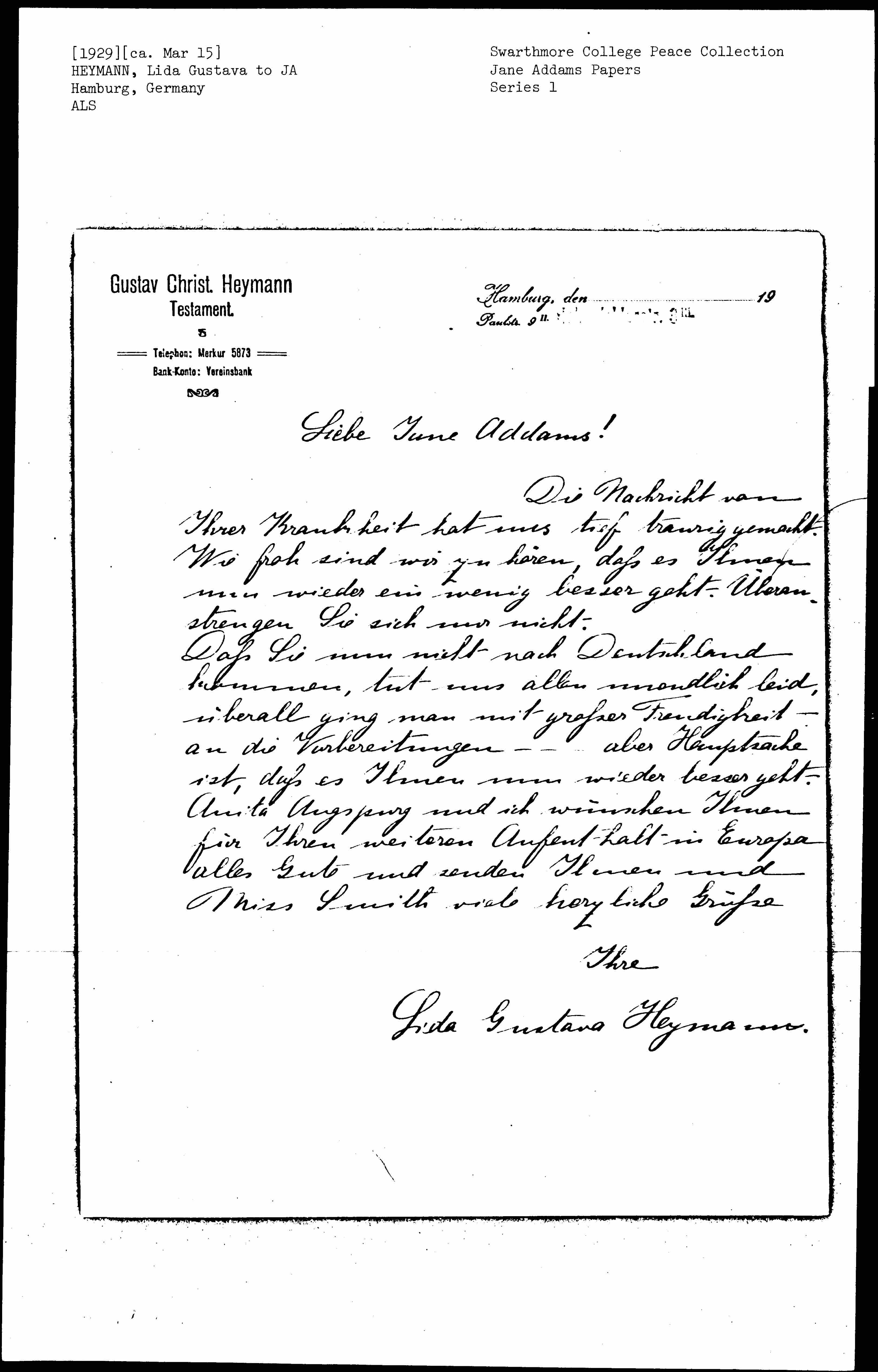 We are very sorry that you can't come to Germany, there is great friendship here for you but the main thing is that you get better again. Anita Augspurg and I wish that your trip to Europe is always good, and send you and Miss Smith many heartfelt sweethings.