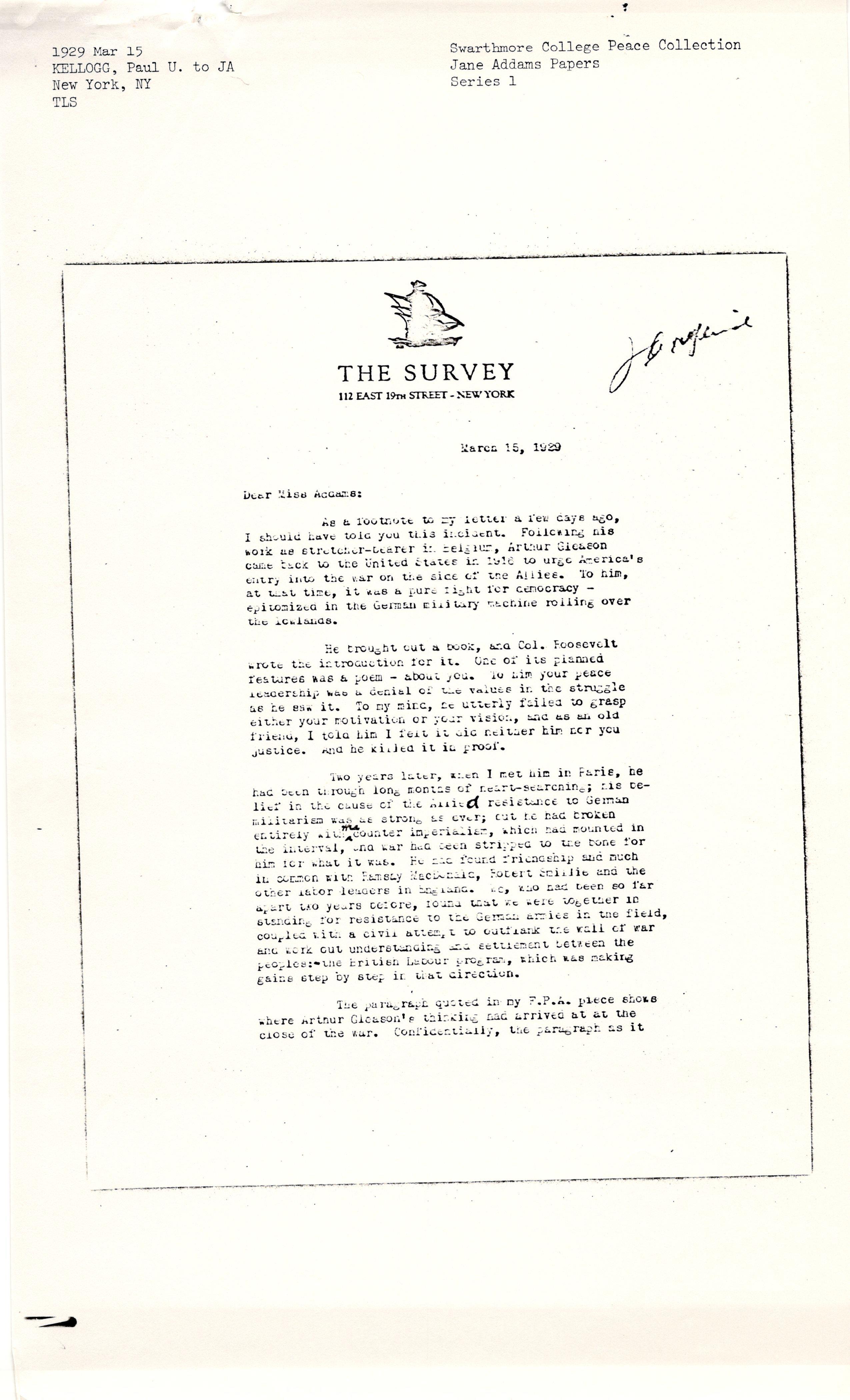 Paul Underwood Kellogg to Jane Addams, March 13, 1929