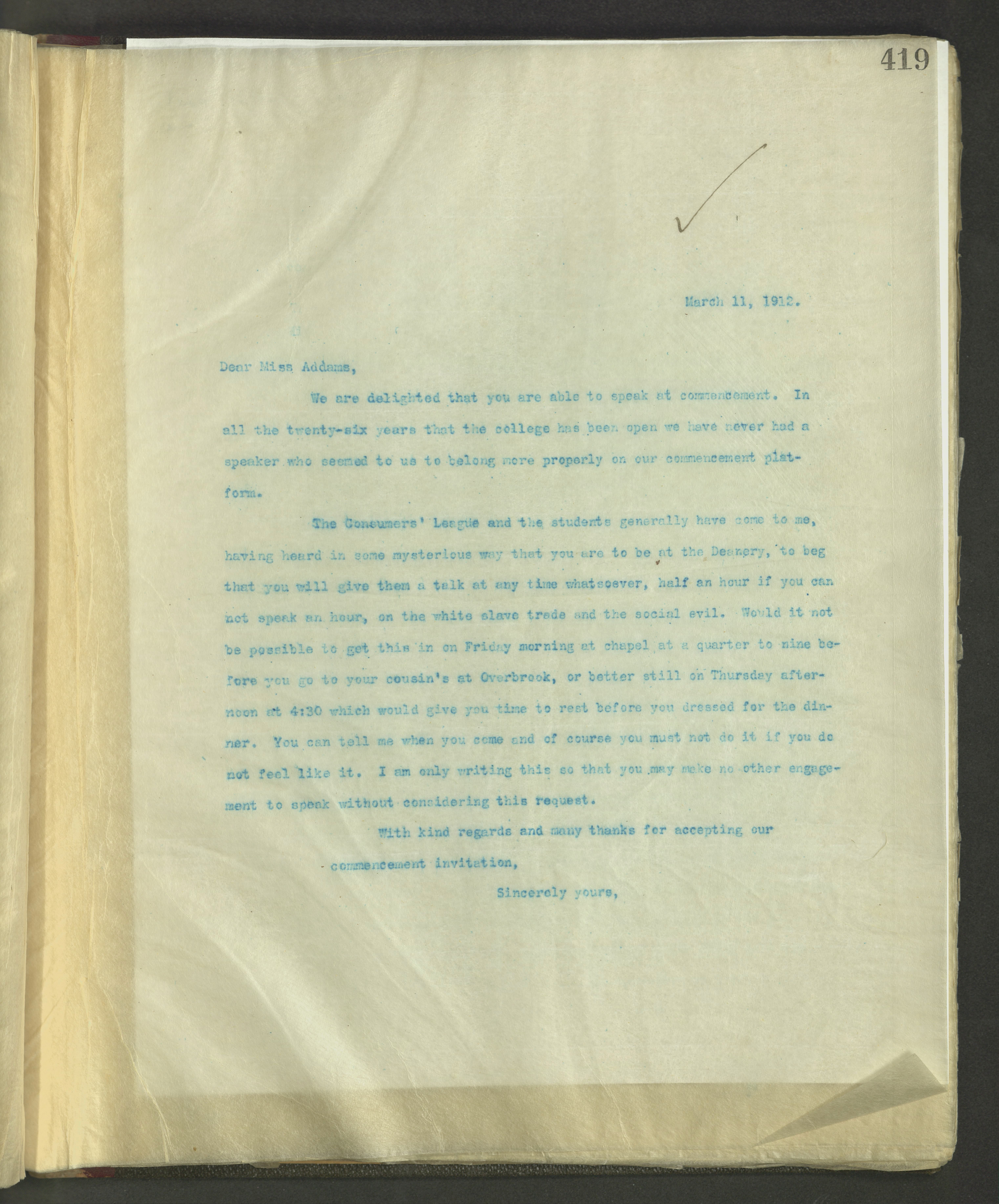 We are delighted that you are able to speak at commencement. In all the twenty-six years that the college has been open we have never had a speaker who seemed to us to belong more properly on our commencement platform.