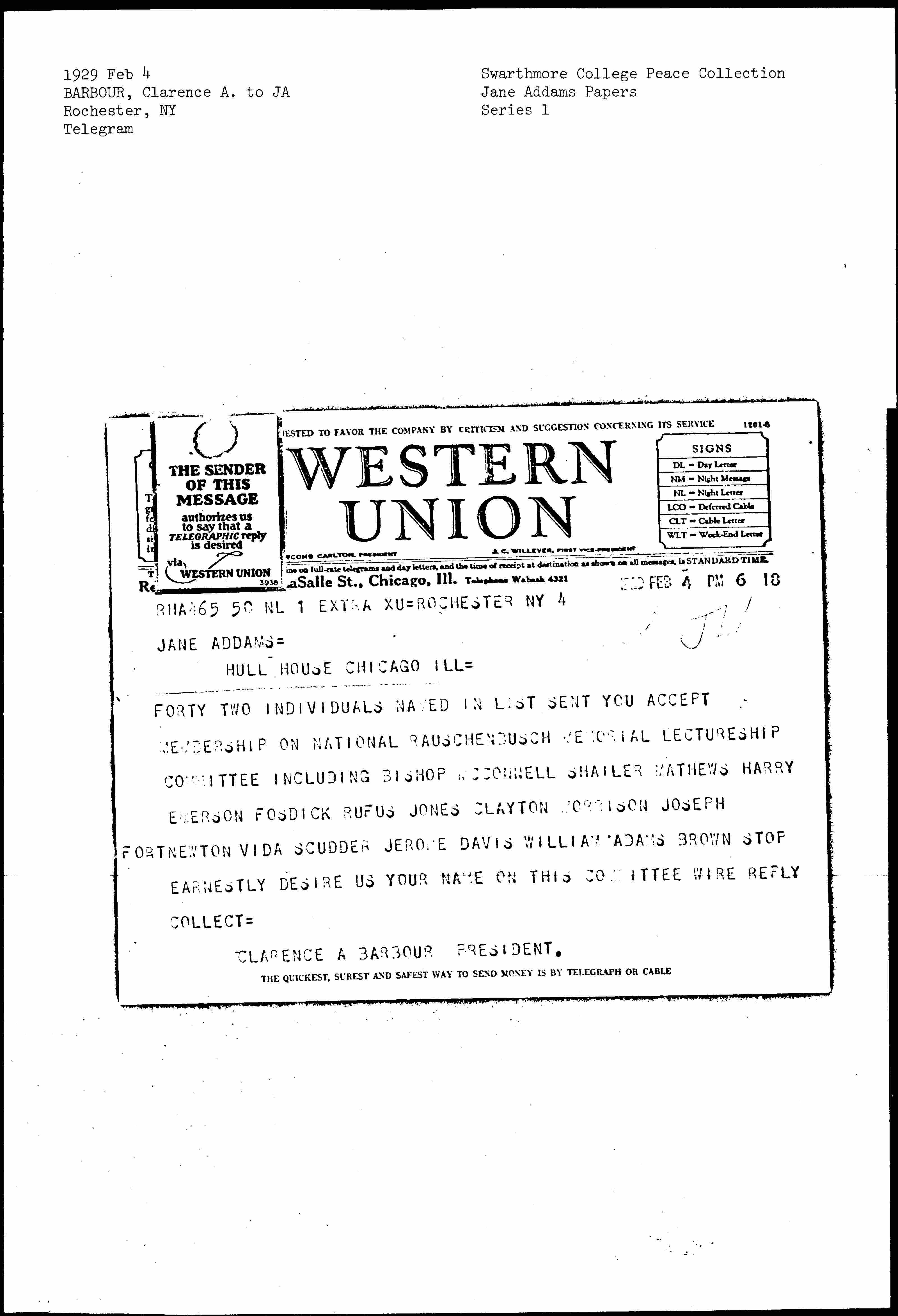 Clarence Augustus Barbour to Jane Addams, February 4, 1929
