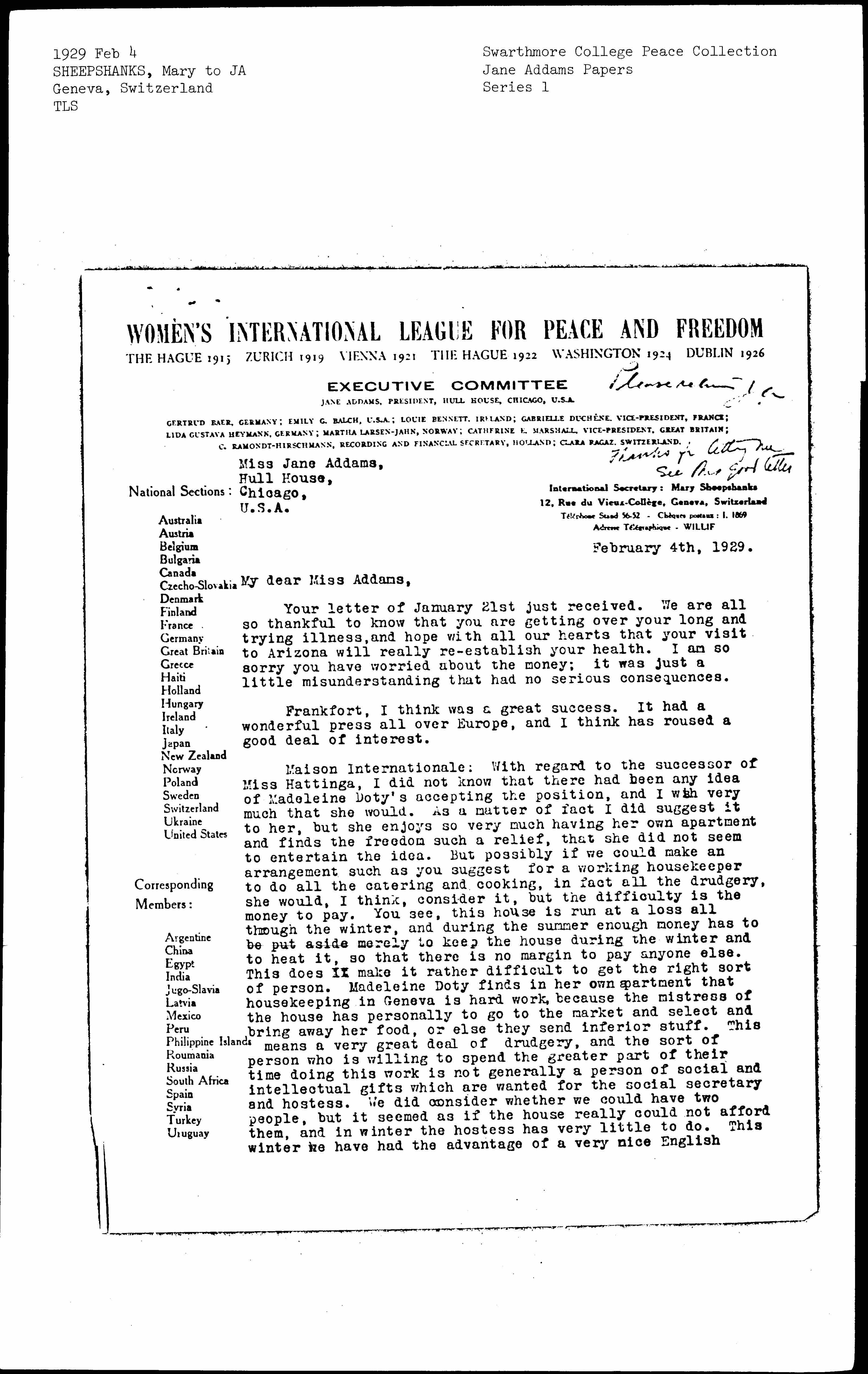 Mary Ryott Sheepshanks to Jane Addams, February 4, 1929