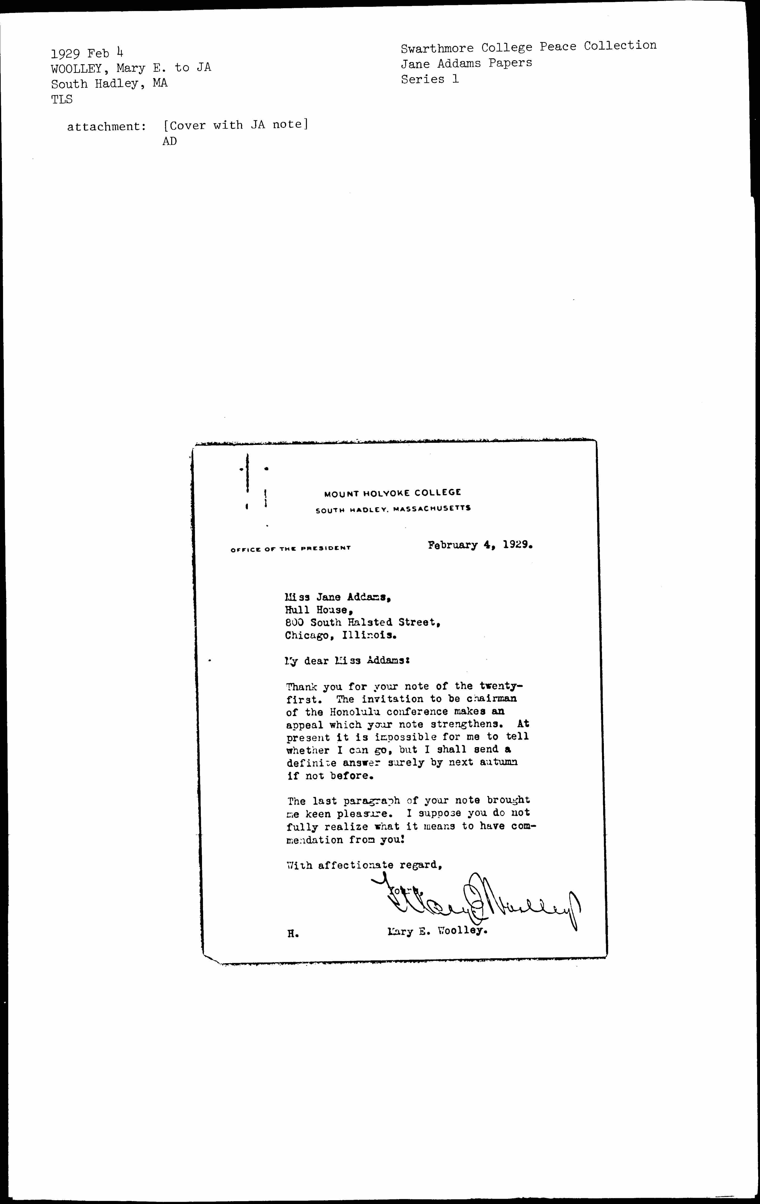 Mary Emma Woolley to Jane Addams, February 4, 1929