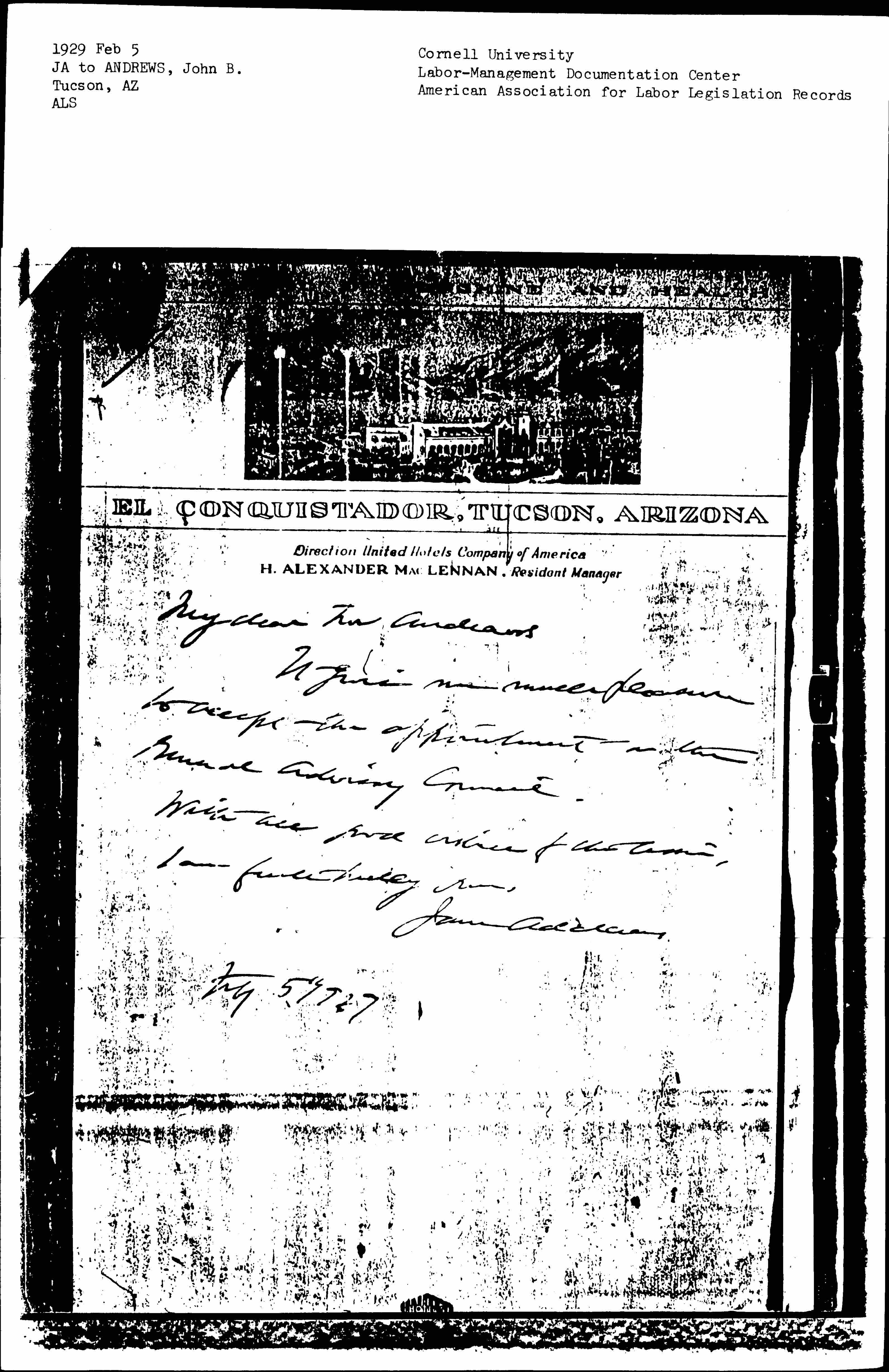 Jane Addams to John Bertram Andrews, February 5, 1929