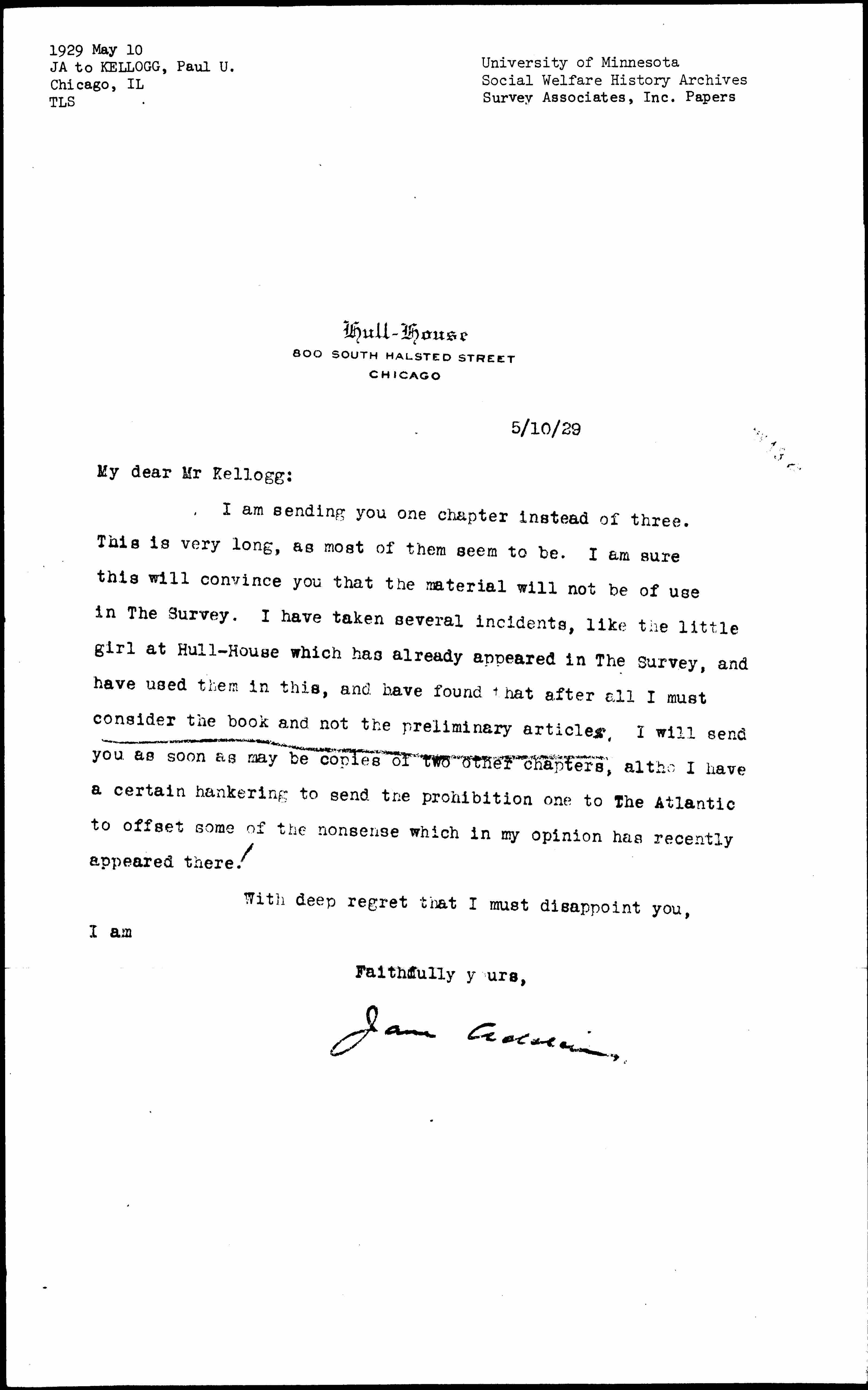 Jane Addams to Paul Underwood Kellogg, May 10, 1929