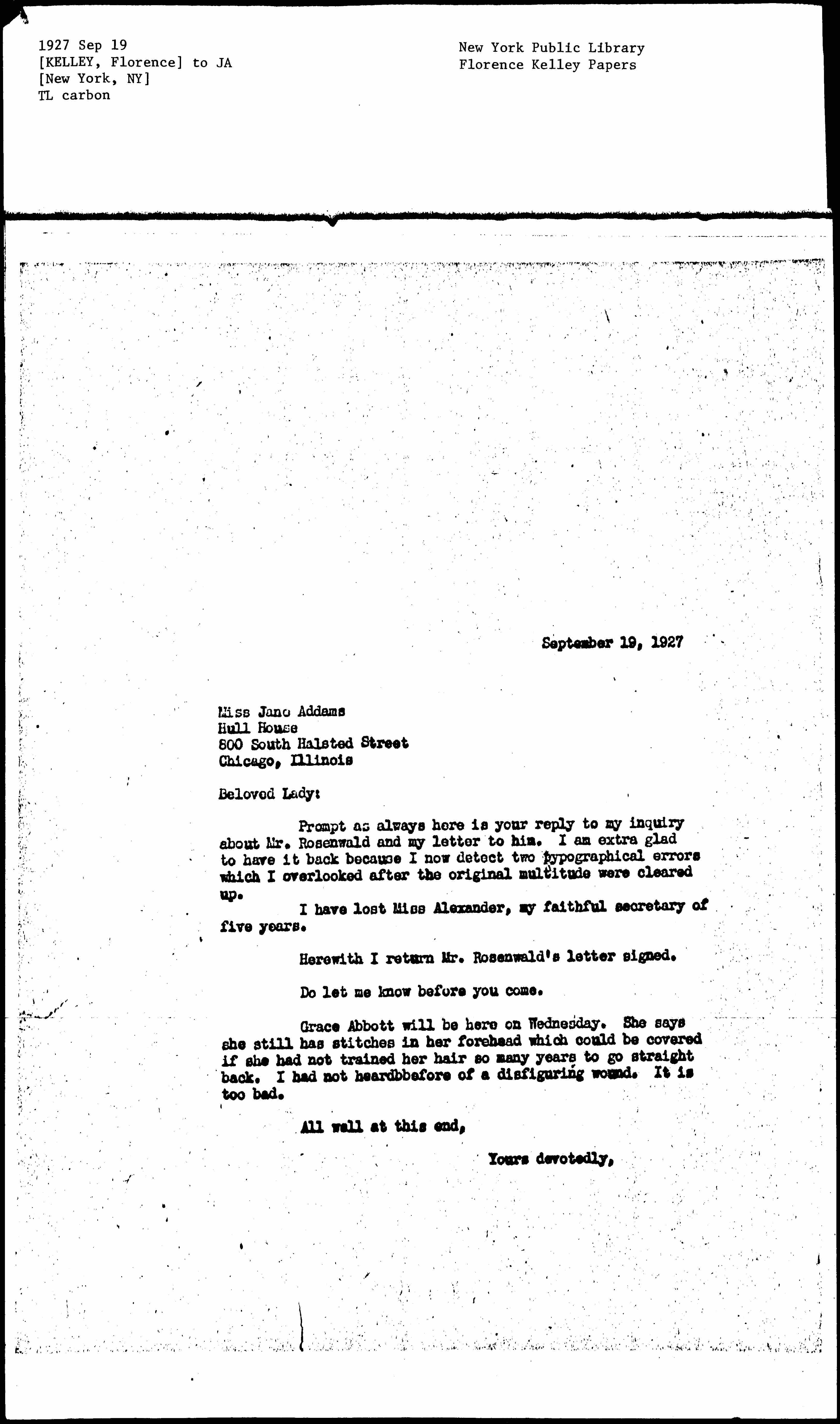 Grace Abbott will be here on Wednesday. She says she still has stitches in her forehead which could be covered if she had not trained her hair so many years to go straight back. I had not heard before of a disfiguring wound. It is too bad.