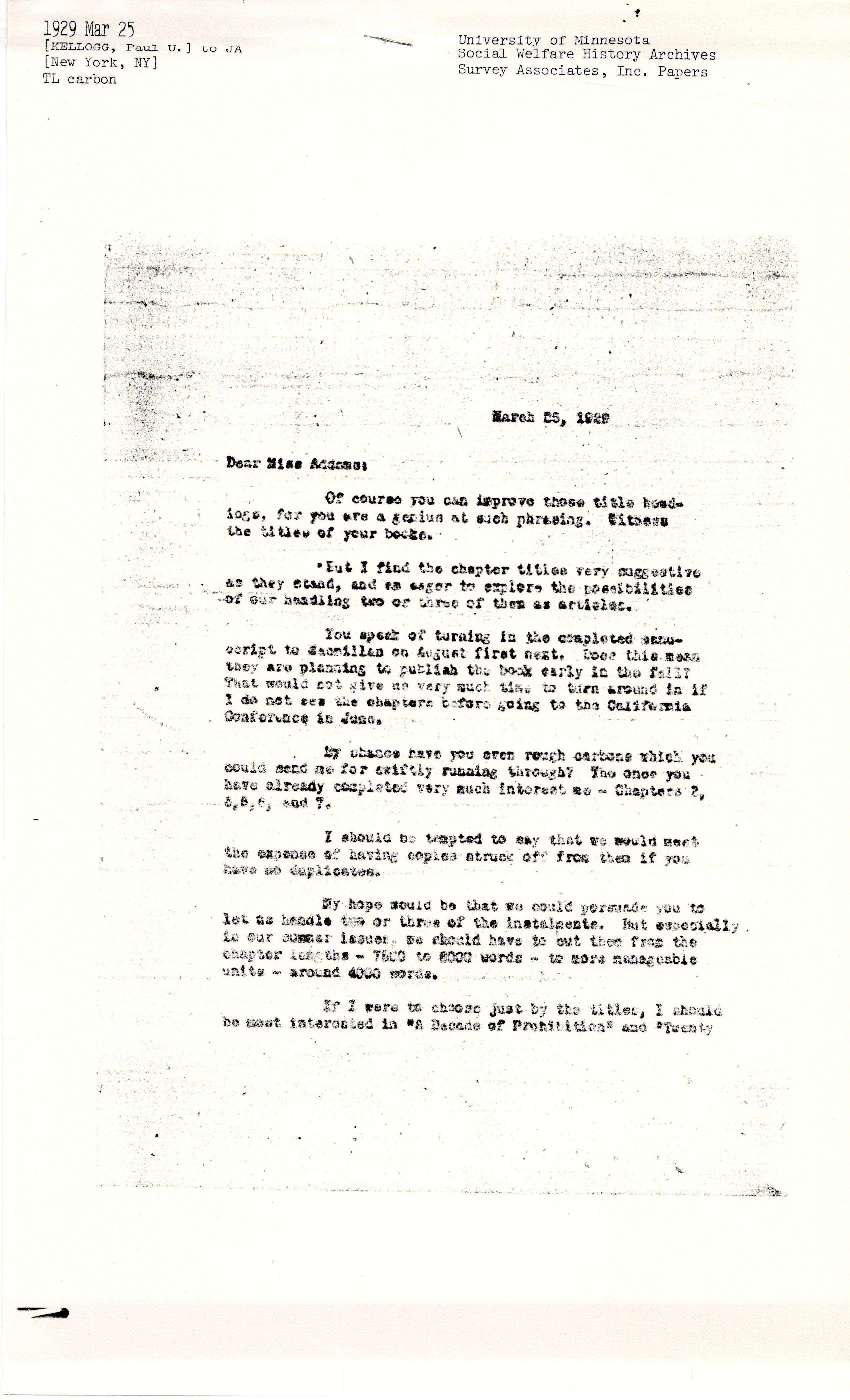 Paul Underwood Kellogg to Jane Addams, March 25, 1929