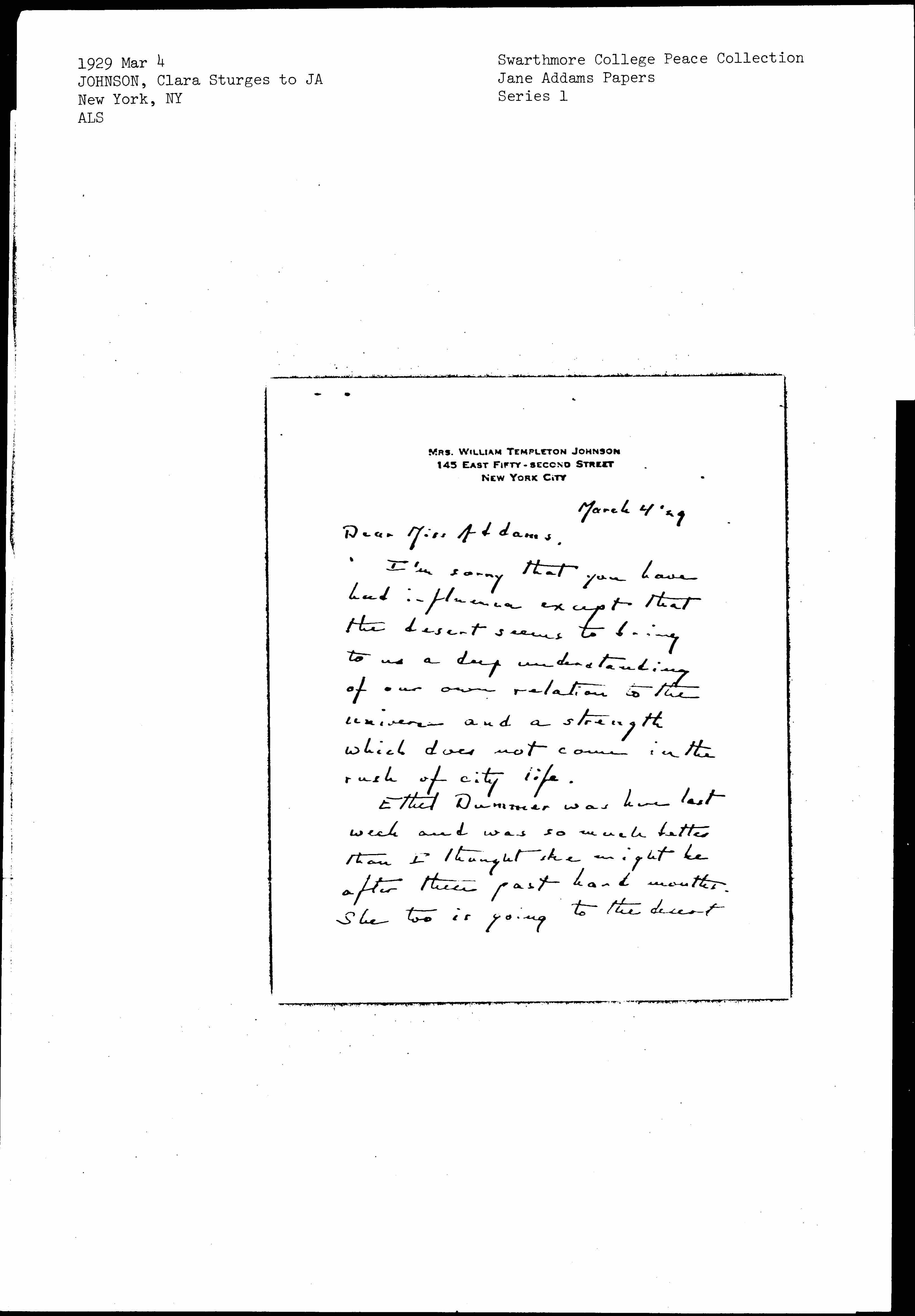 Clara Delafield Sturges Johnson to Jane Addams, March 4, 1929