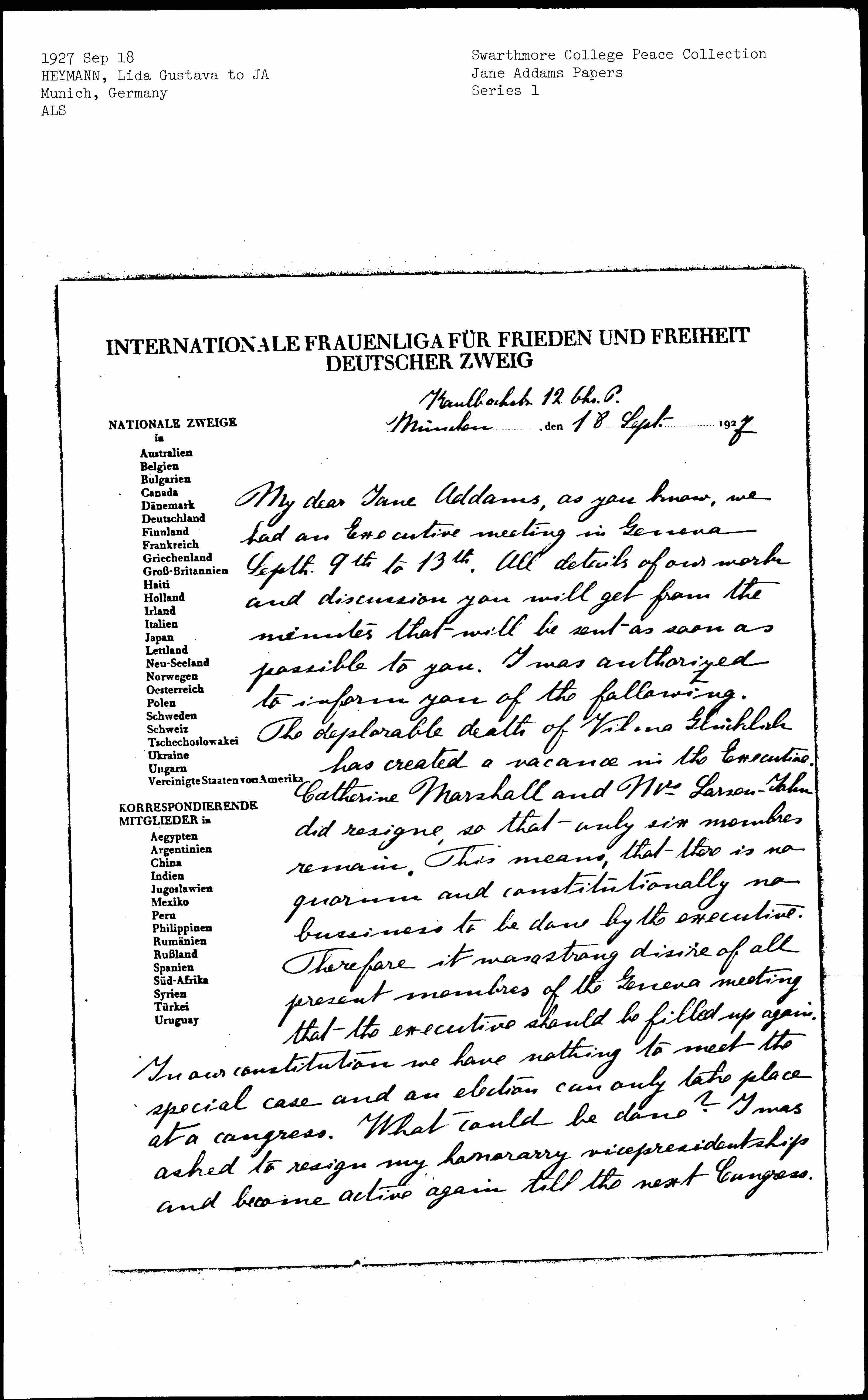 Lida Gustava Heymann to Jane Addams, September 18, 1927