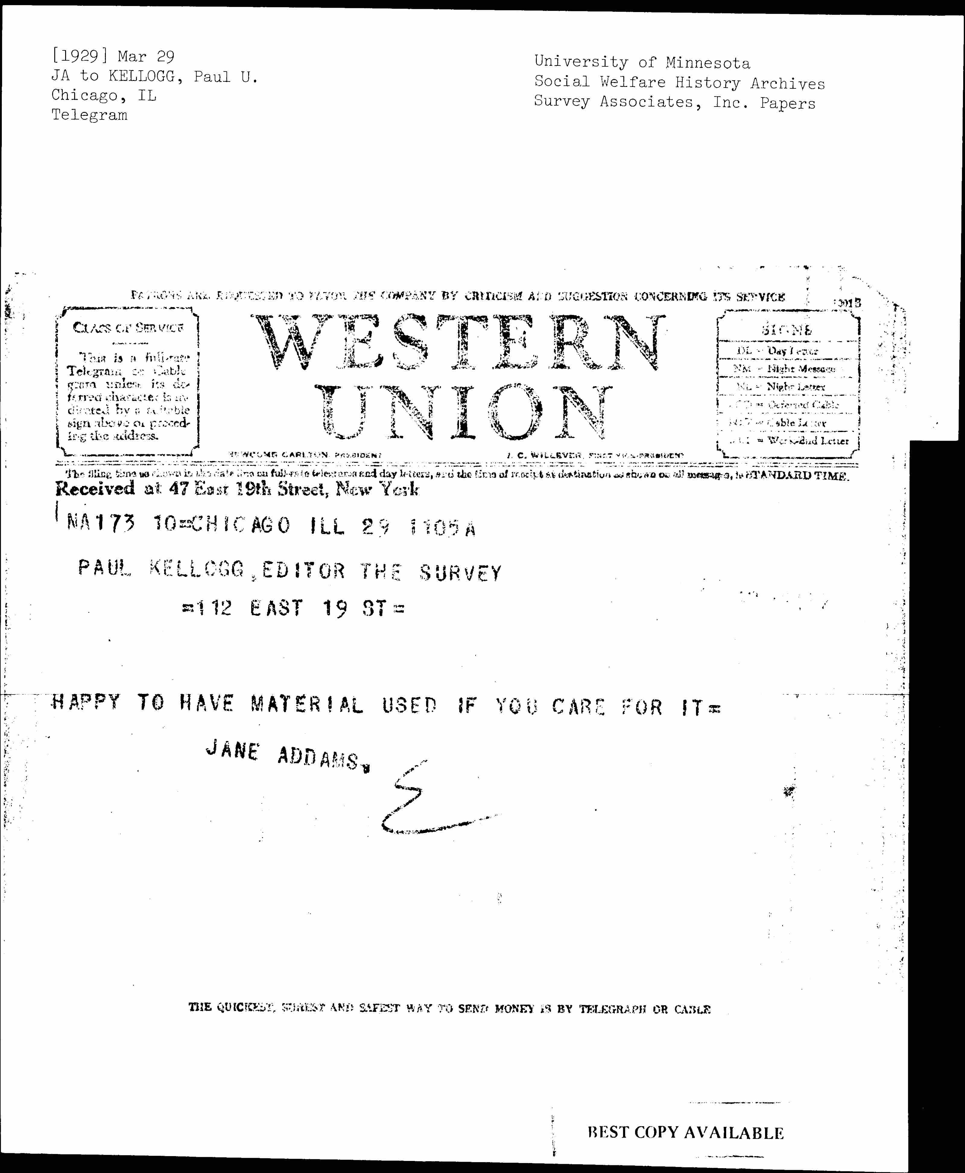 Paul Underwood Kellogg to Jane Addams, March 26, 1929