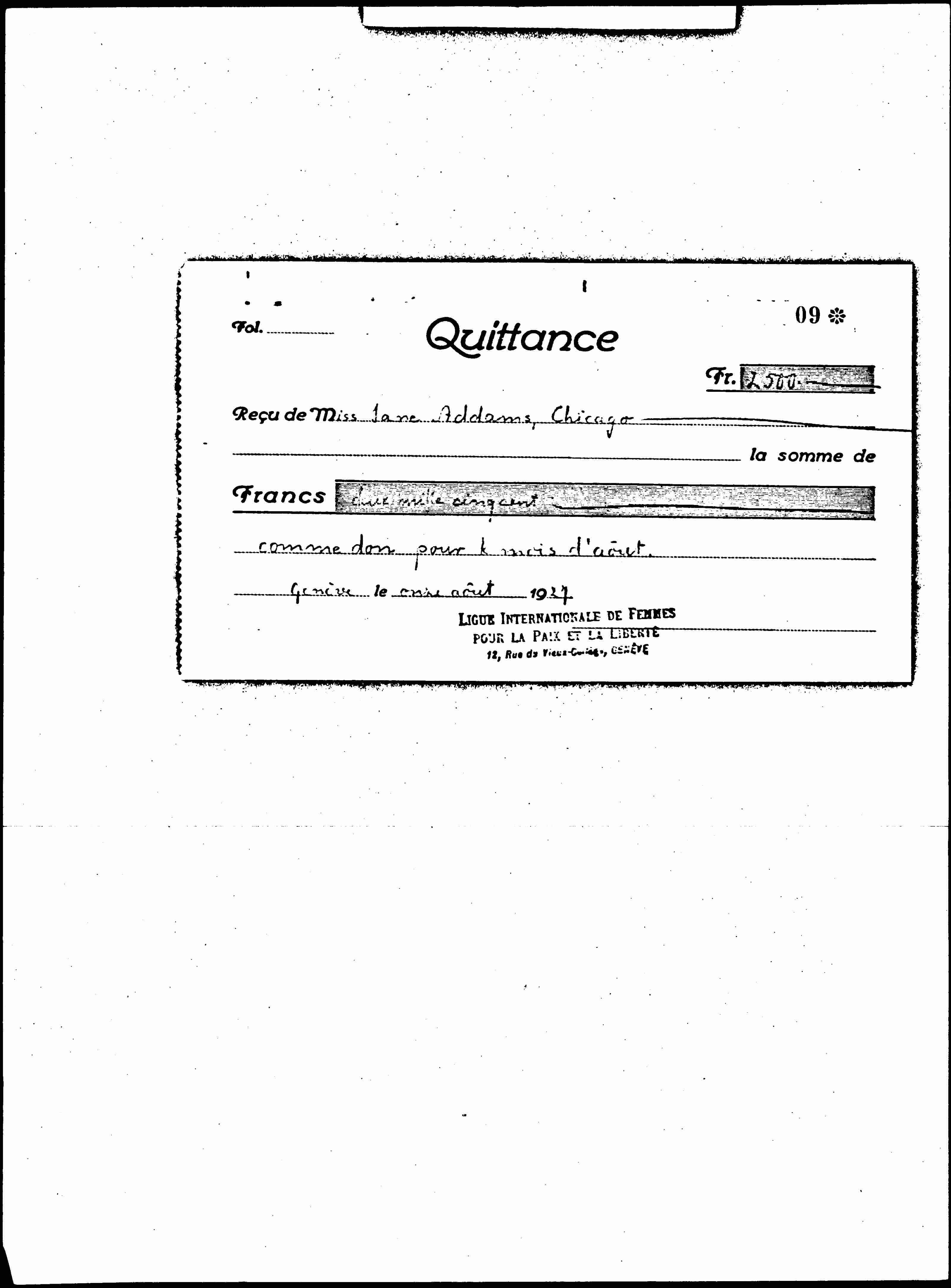 Women's International League for Peace and Freedom, Receipt, September 16, 1927