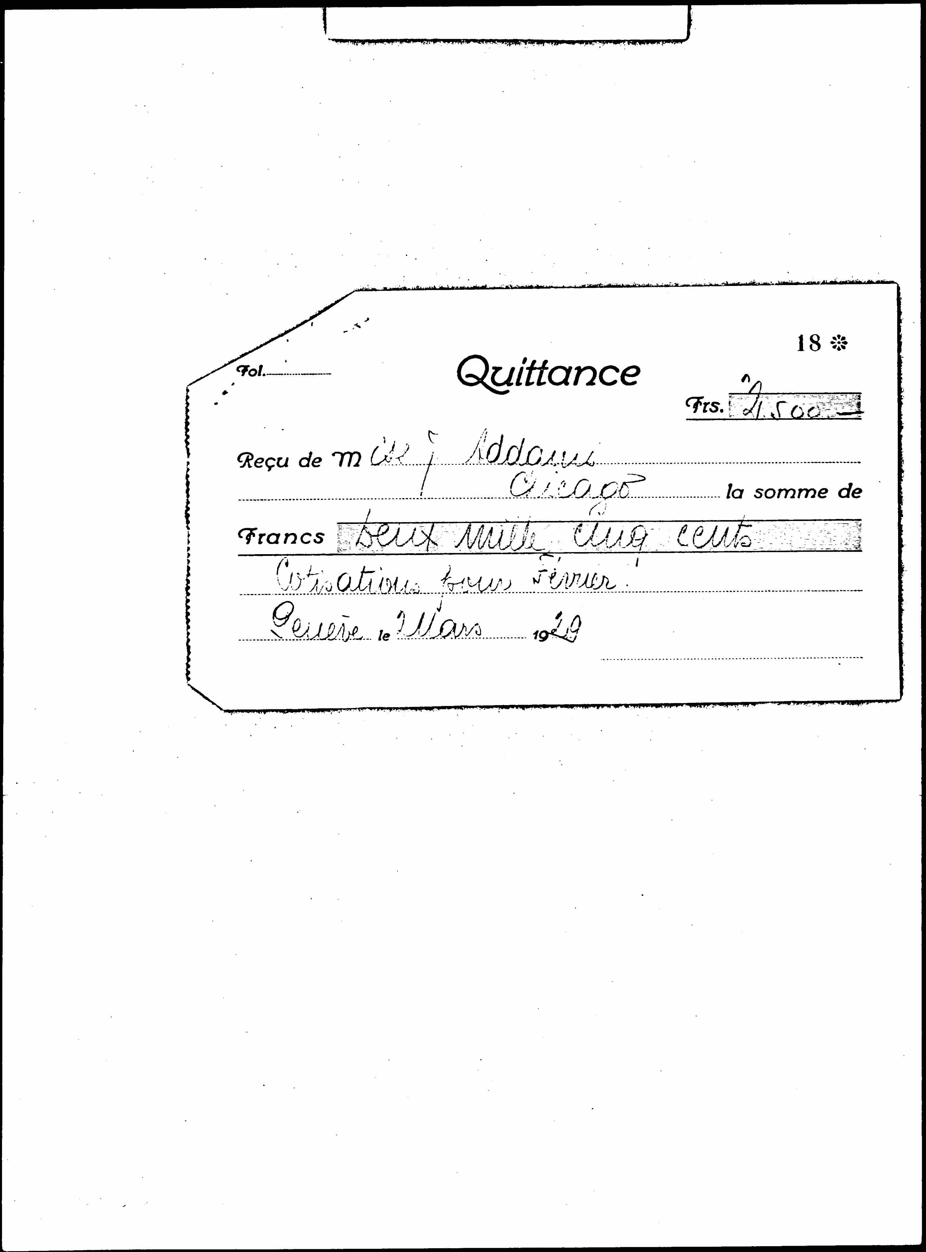 Received from ↑Miss Addams Chicago↓ the sum of ↑Two thousand five hundred francs for Férrier↓