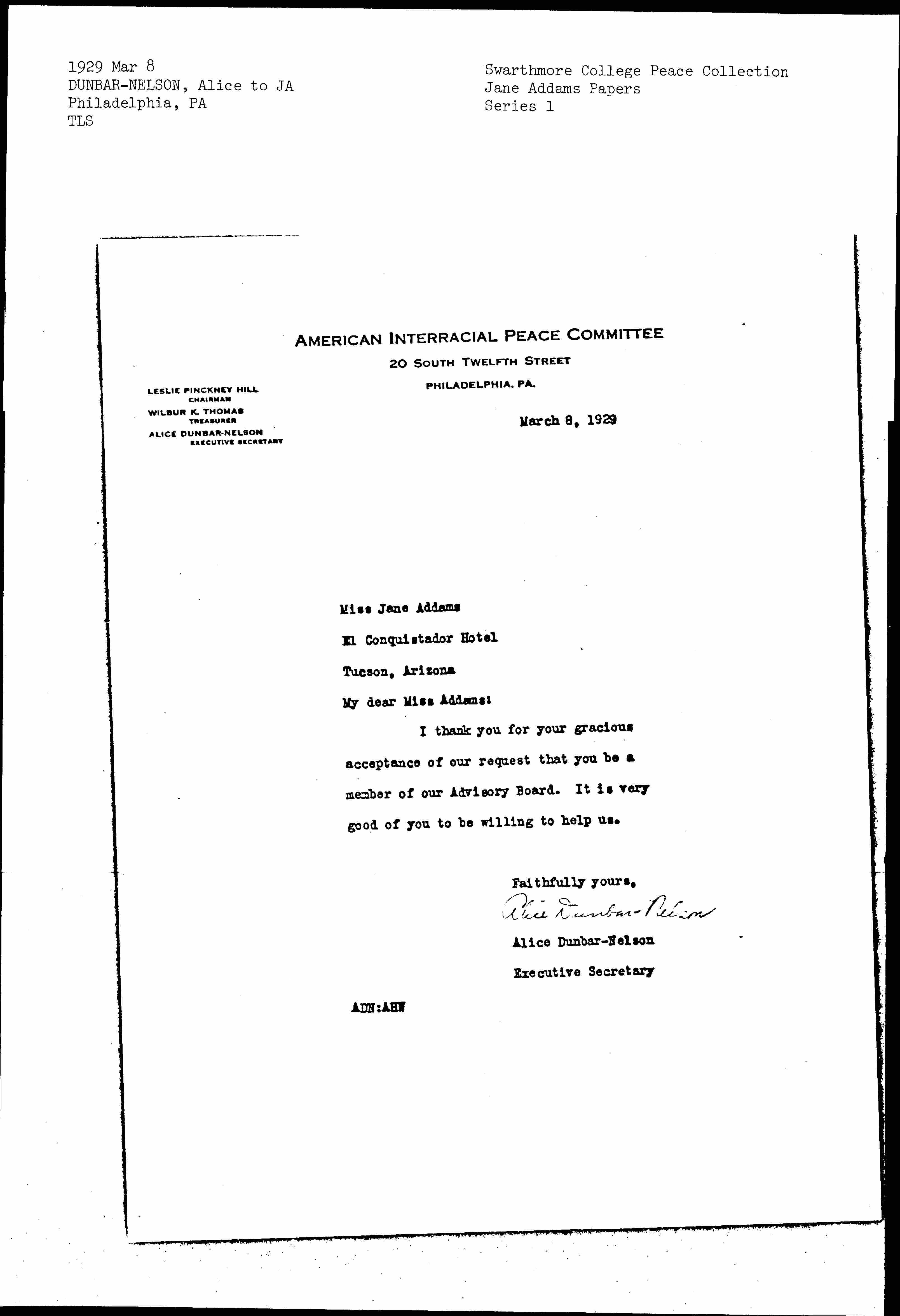 Alice Moore Dunbar-Nelson to Jane Addams, March 8, 1929