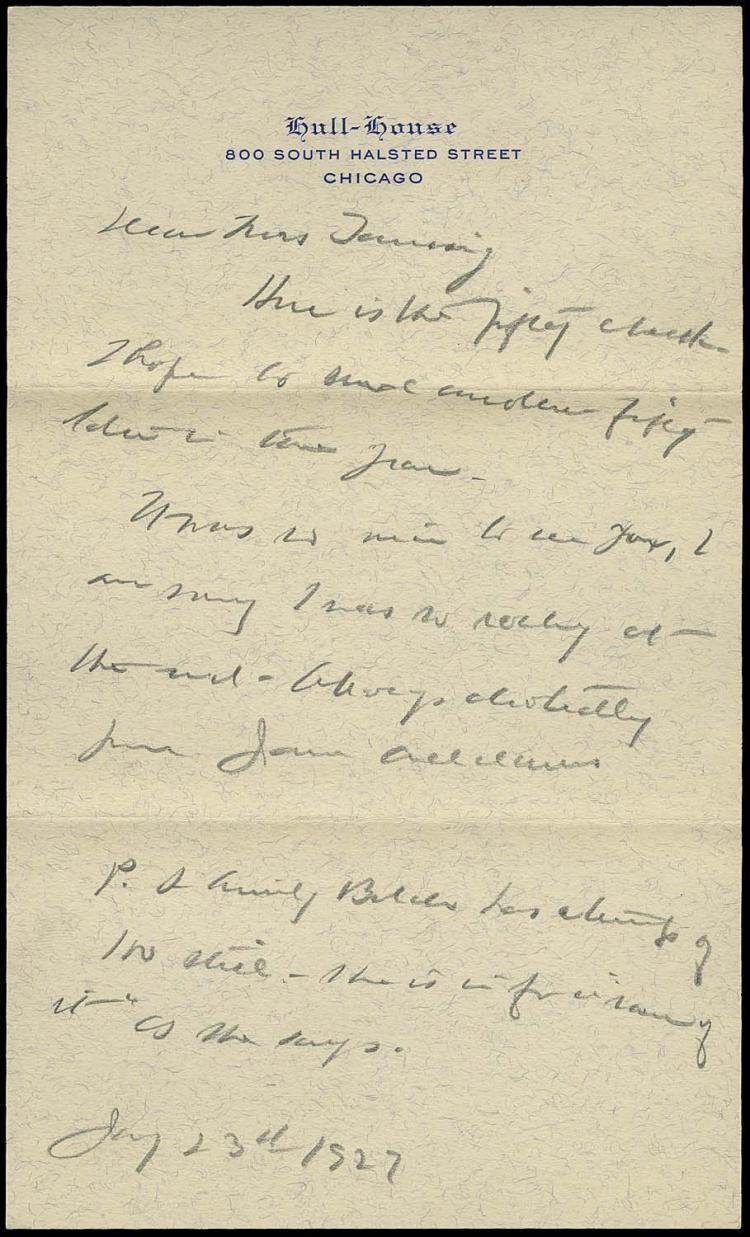 It was so nice to see you, I am sorry I was so rarely at the end. Always devotedly yours Jane Addams