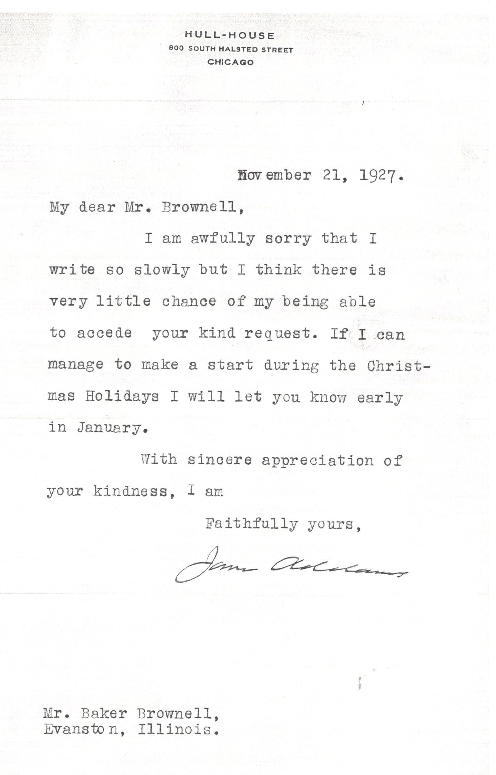 Jane Addams to Baker Brownell, November 21, 1927