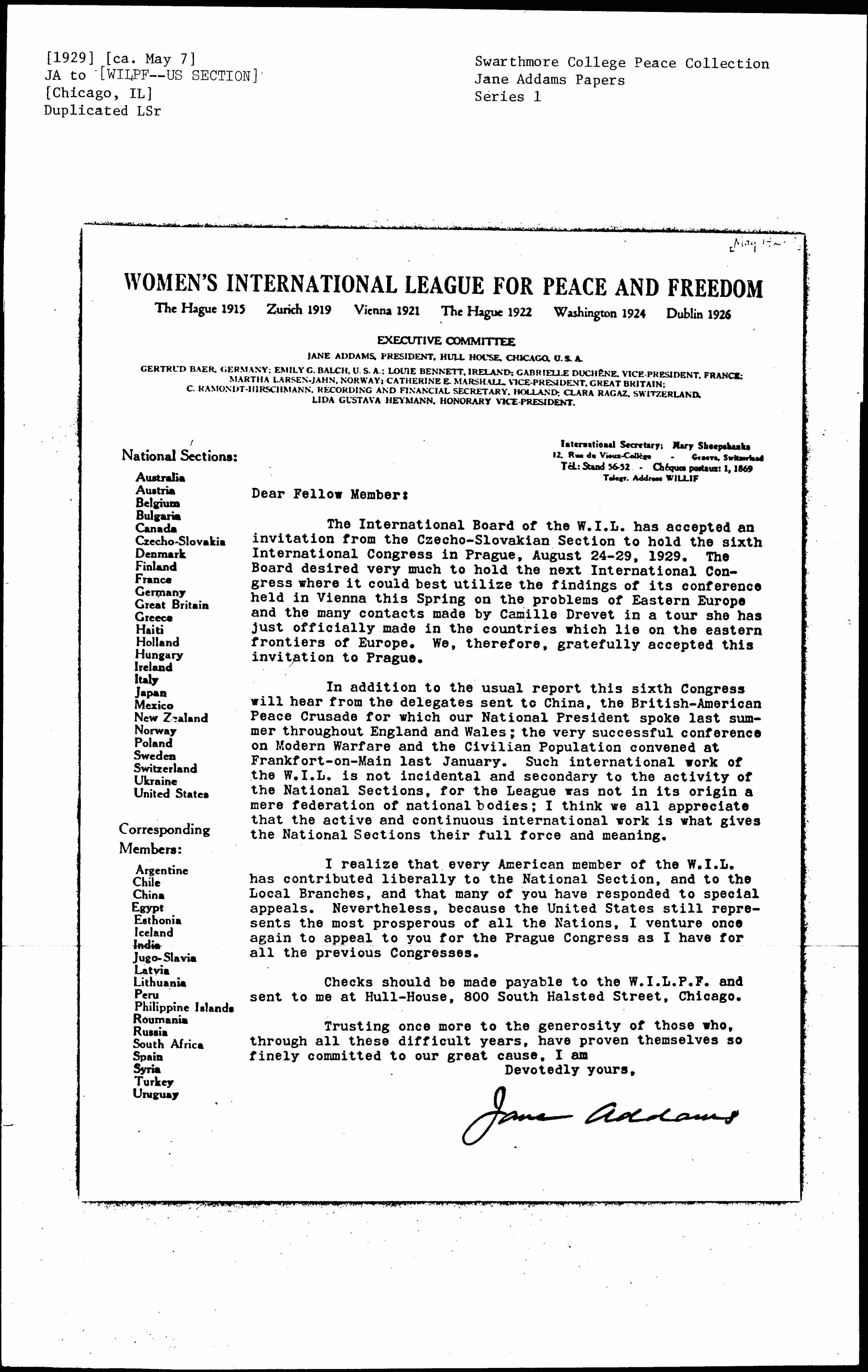 Jane Addams to Members of the Women's International League for Peace and Freedom, United States Section, May 7, 1929