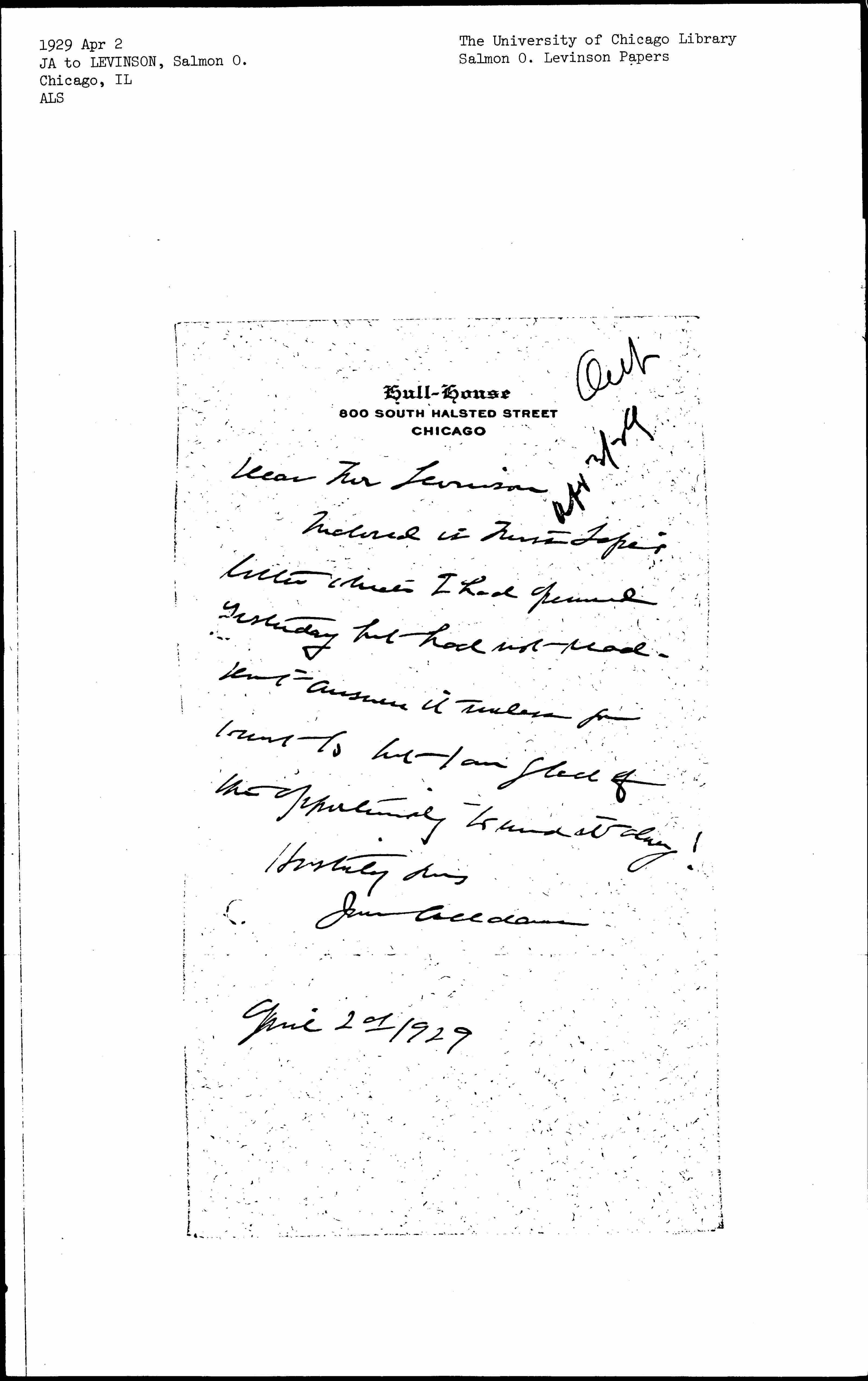 Jane Addams to Salmon Oliver Levinson, April 2, 1929
