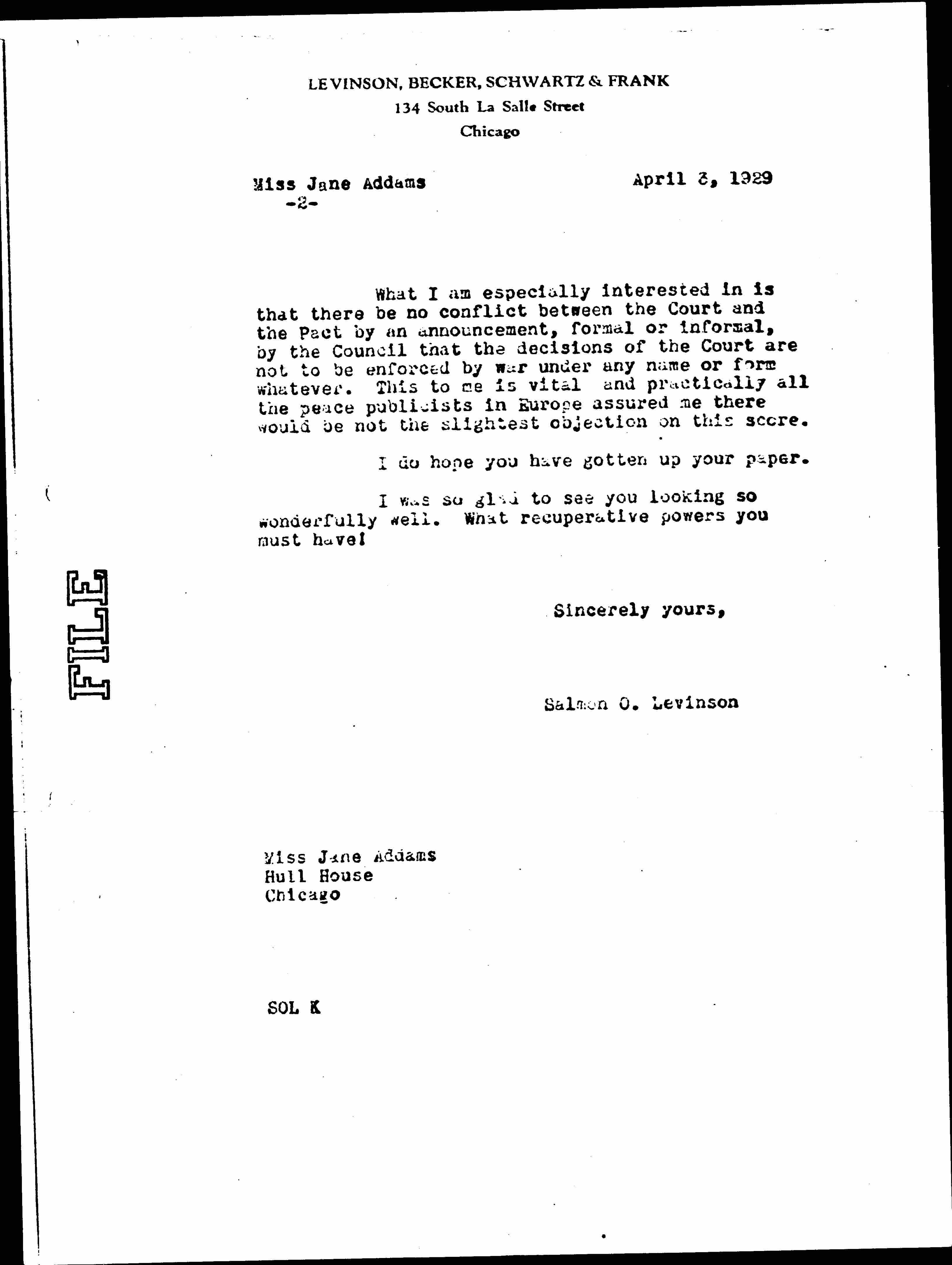 Jane Addams to Salmon Oliver Levinson, April 2, 1929