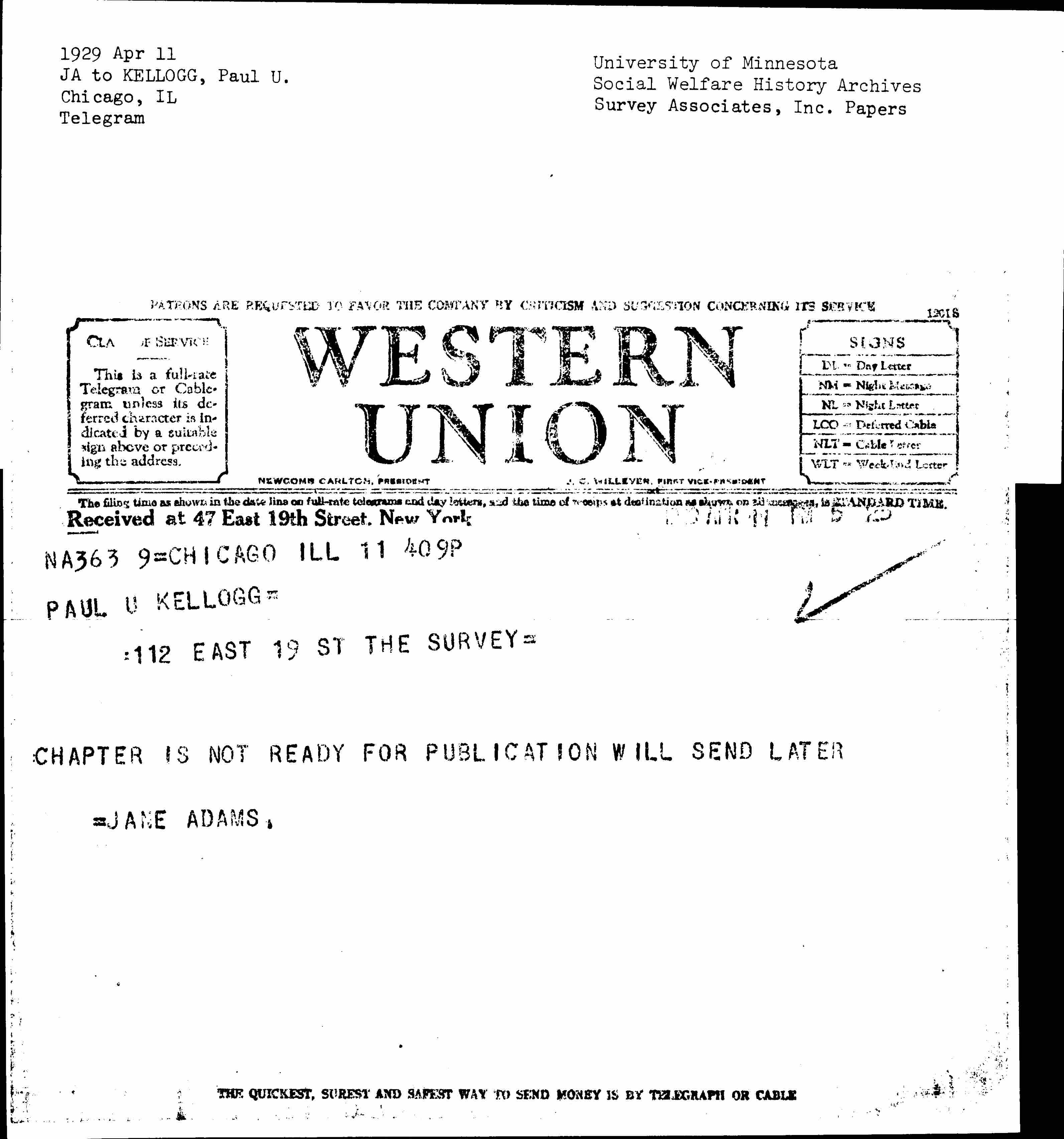 Jane Addams to Paul Underwood Kellogg, April 11, 1929