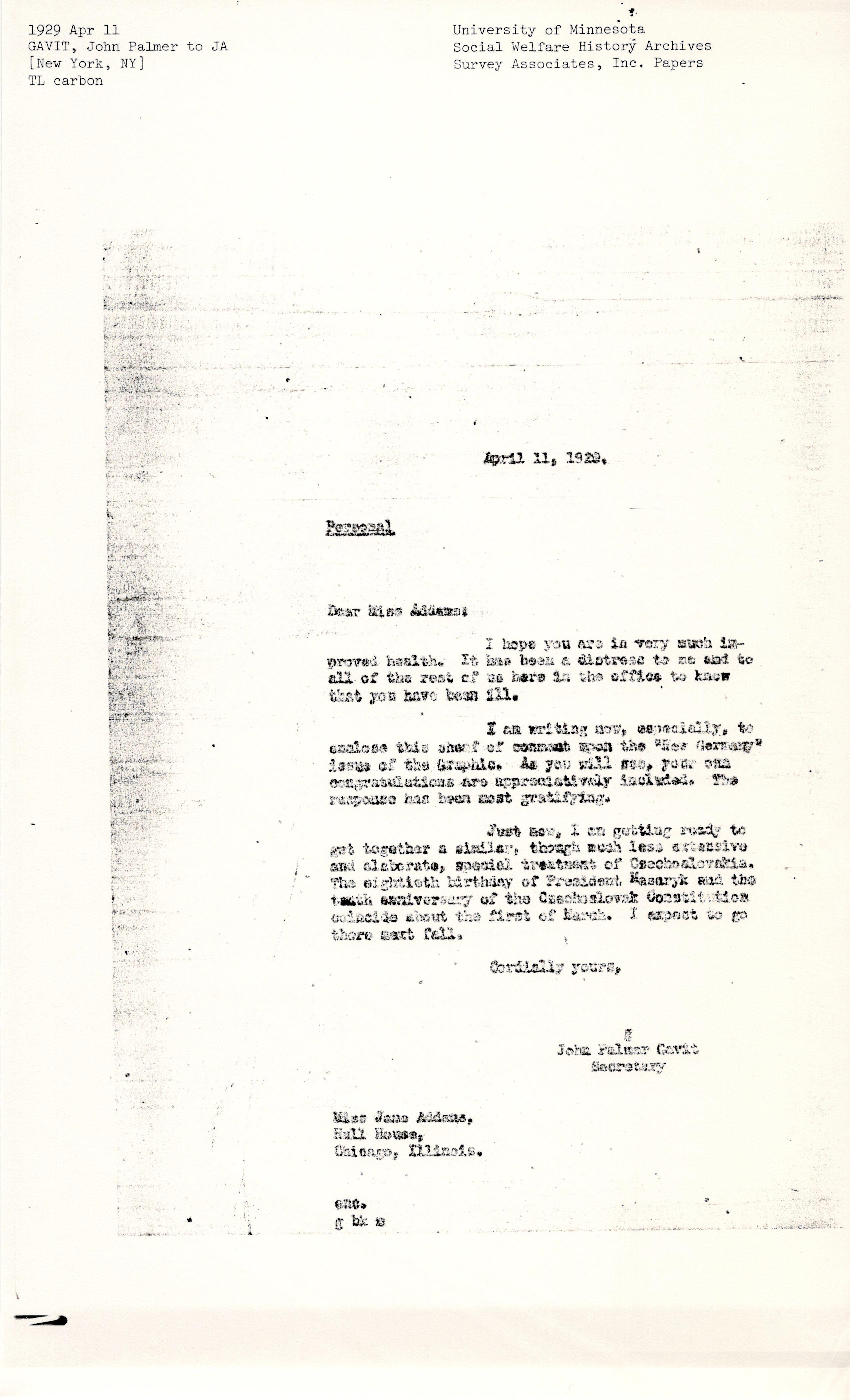 John Palmer Gavit to Jane Addams, April 11, 1929