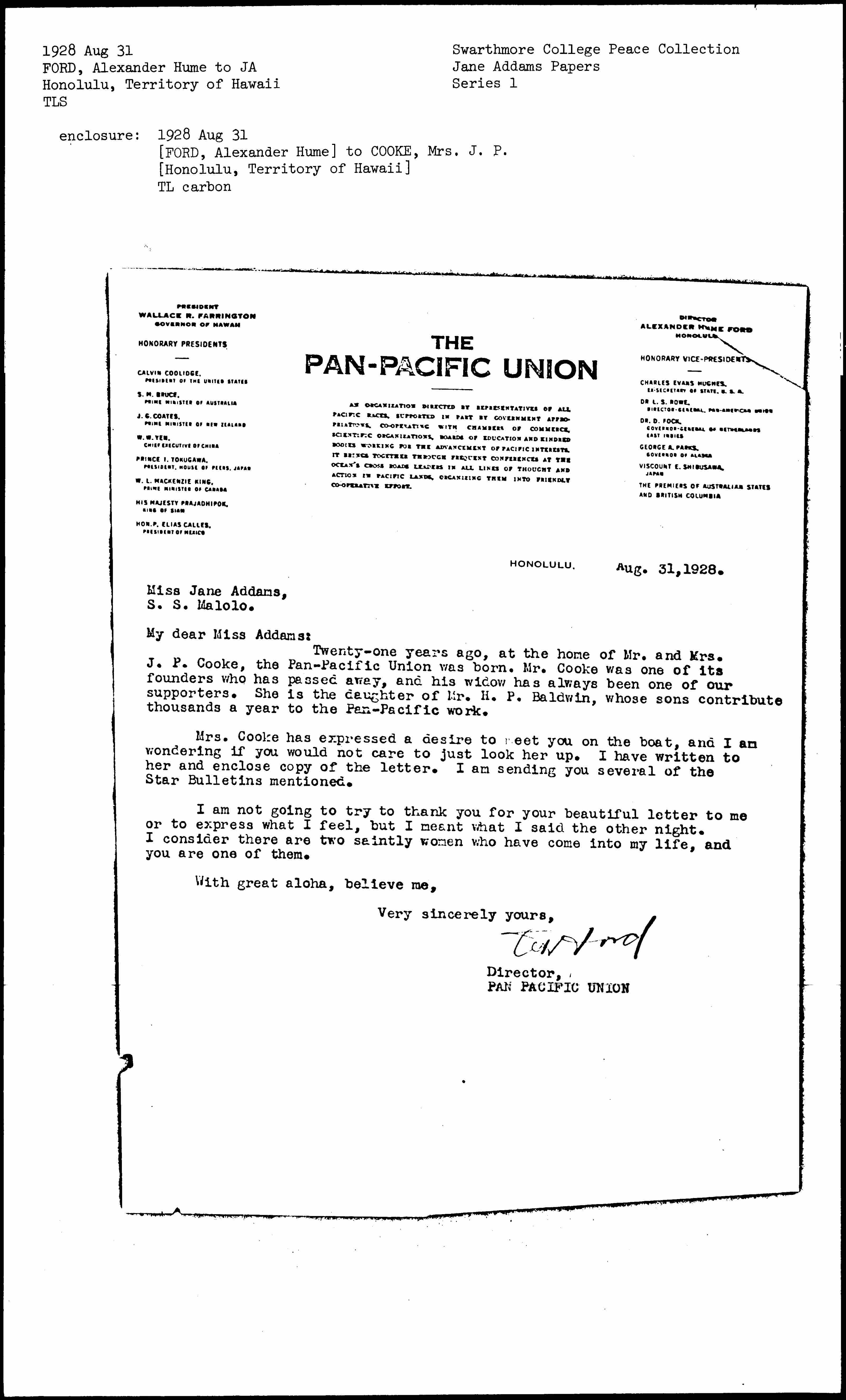 Alexander Hume Ford to Jane Addams, August 31, 1928