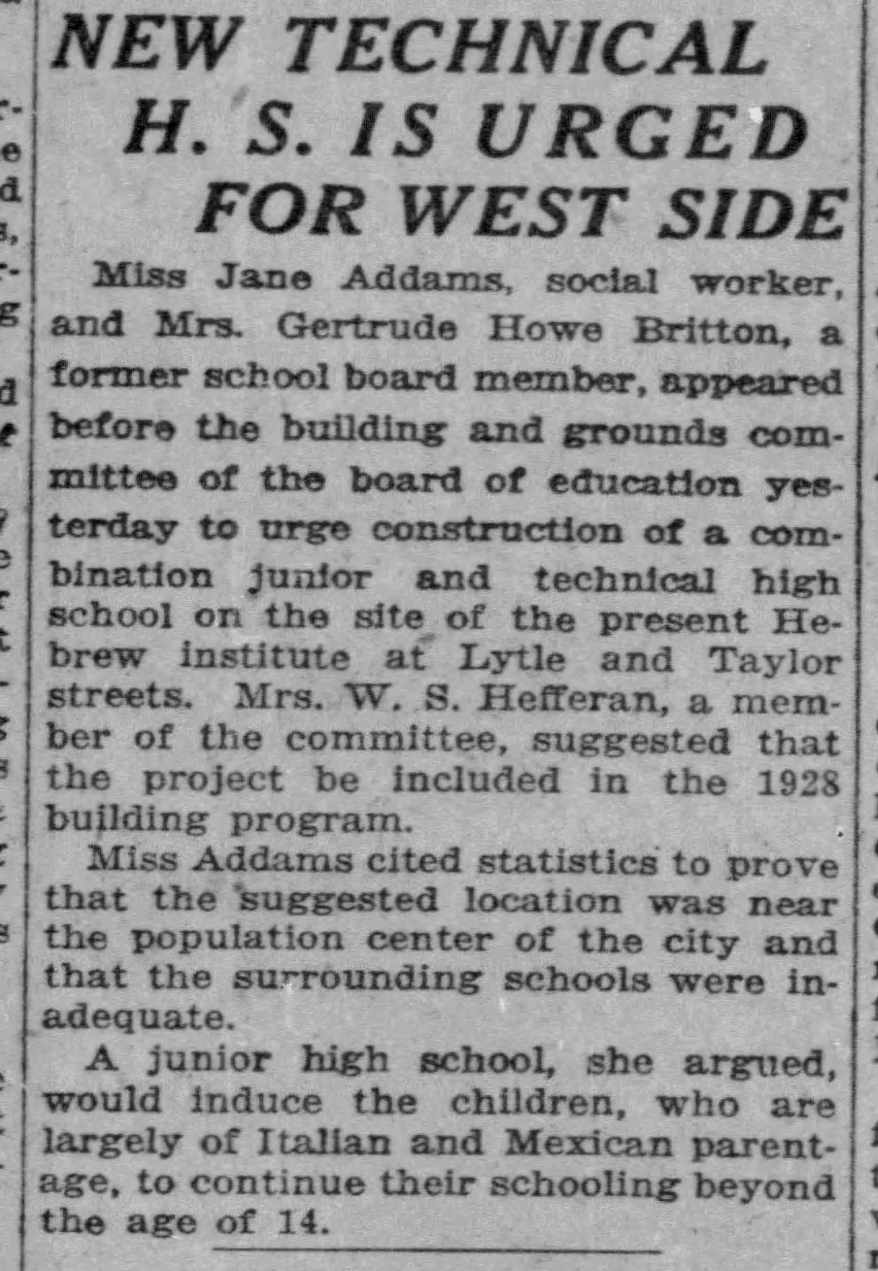 Miss Jane Addams, social worker, and Mrs. Gertrude Howe Britton, a former school board member, appeared before the building and grounds committee of the board of education yesterday to urge construction of a combination junior and technical high school on the site of the present Hebrew Institute at Lytle and Taylor streets. Mrs. W. S. Hefferan, a member of the committee, suggested that the project be included in the 1928 building program.