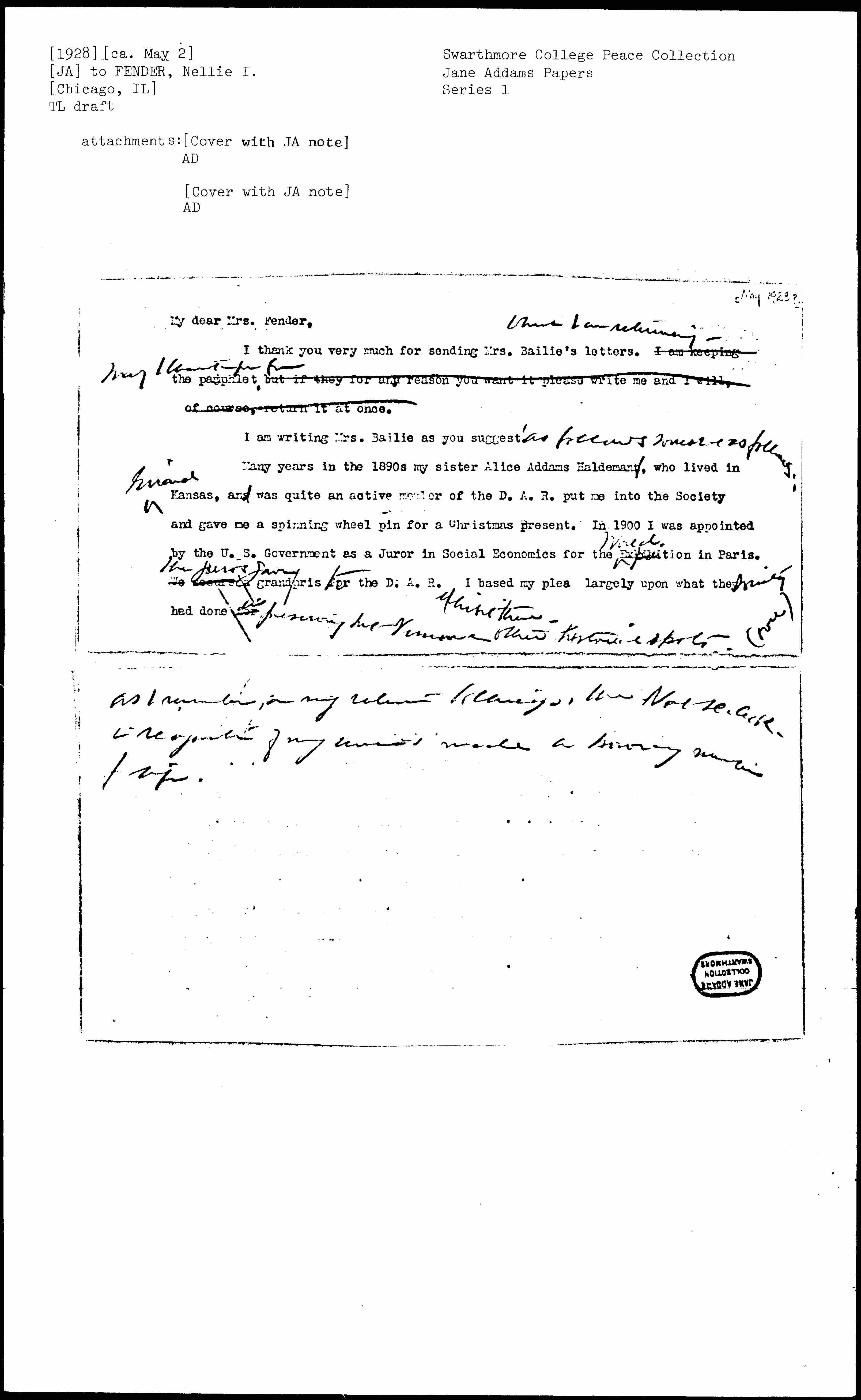 Jane Addams to Nellie Irene Fender, ca. May 2, 1928
