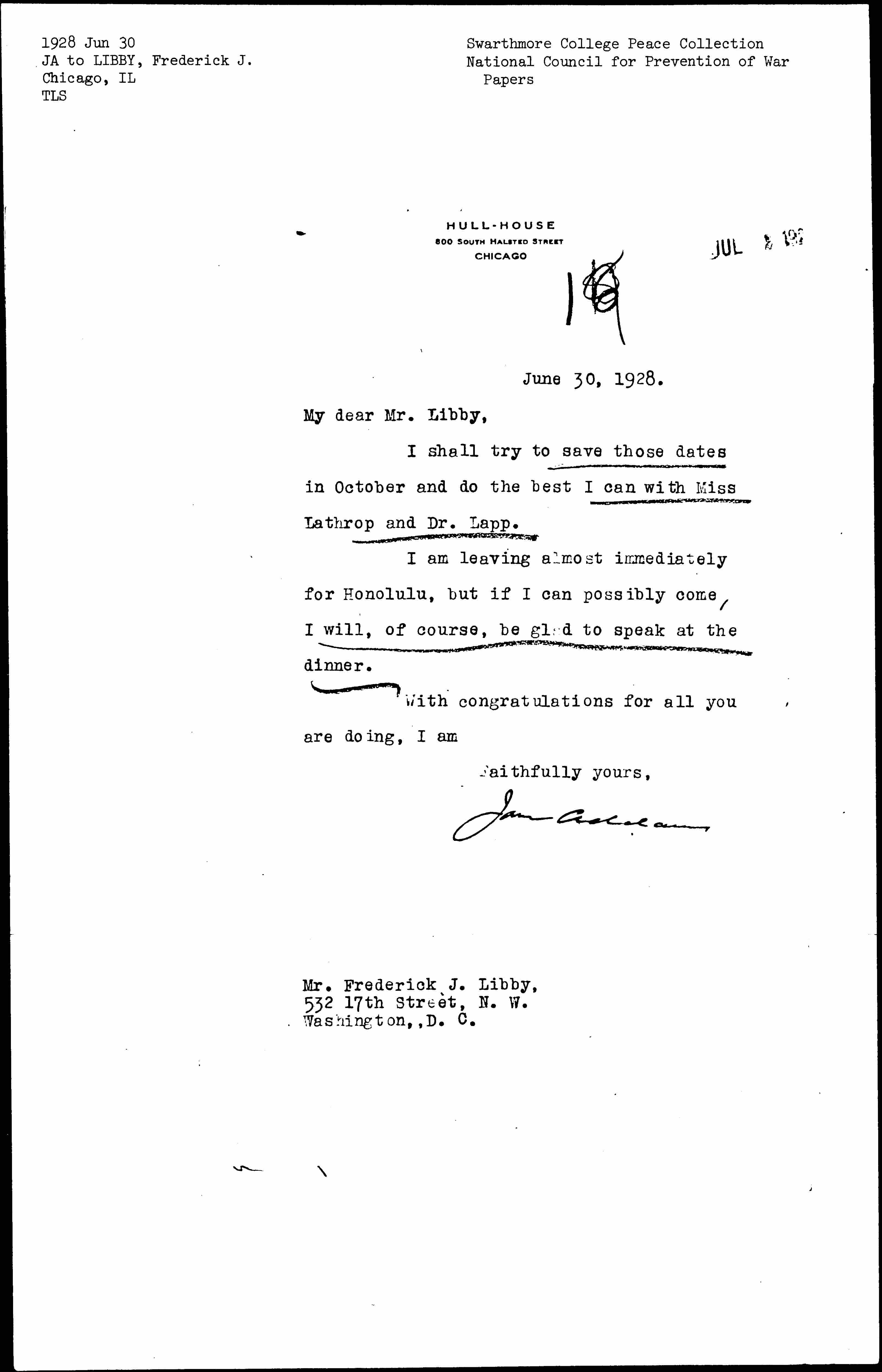 Jane Addams to Frederick Joseph Libby, June 30, 1928