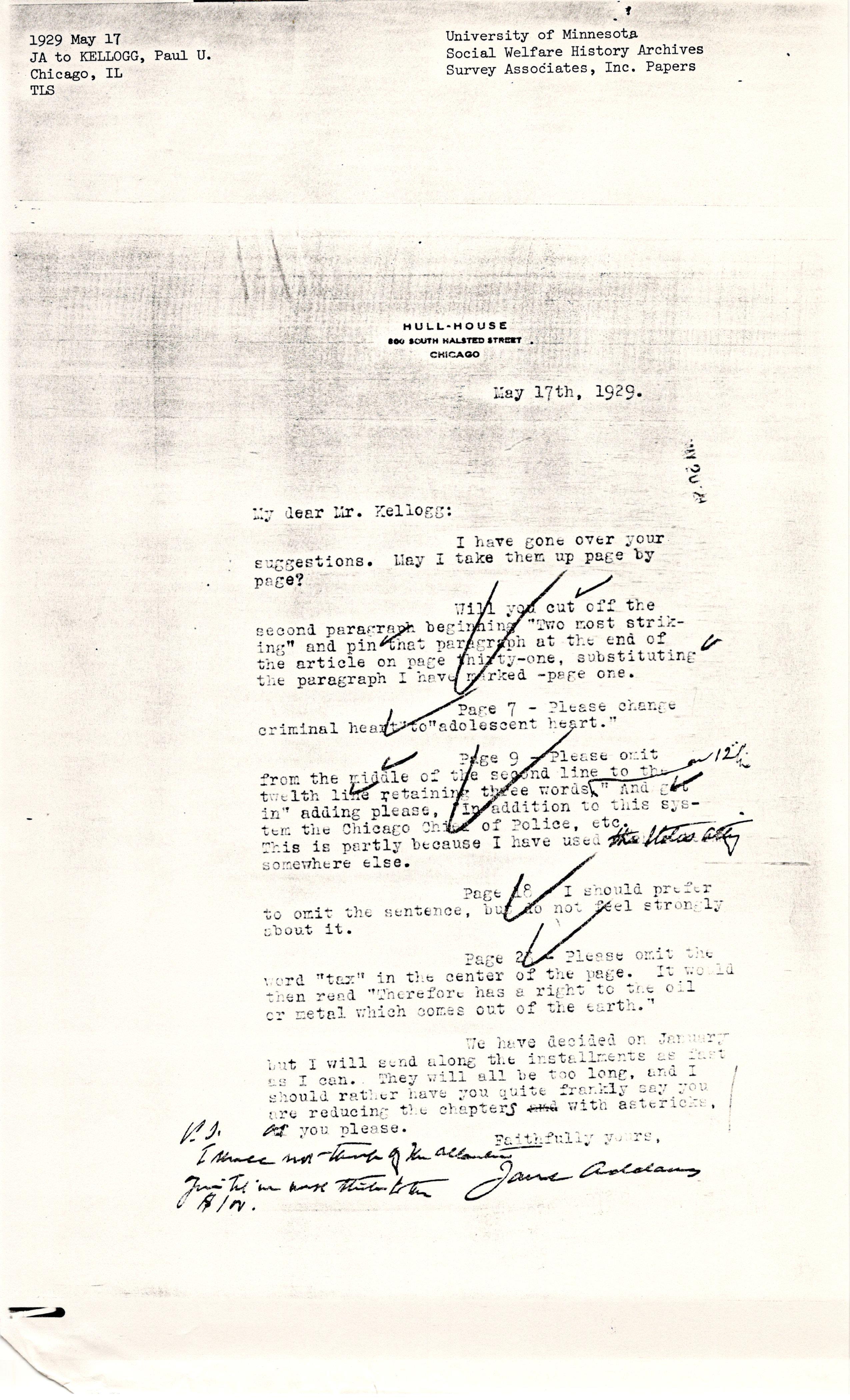 Paul Underwood Kellogg to Jane Adams, May 20, 1929