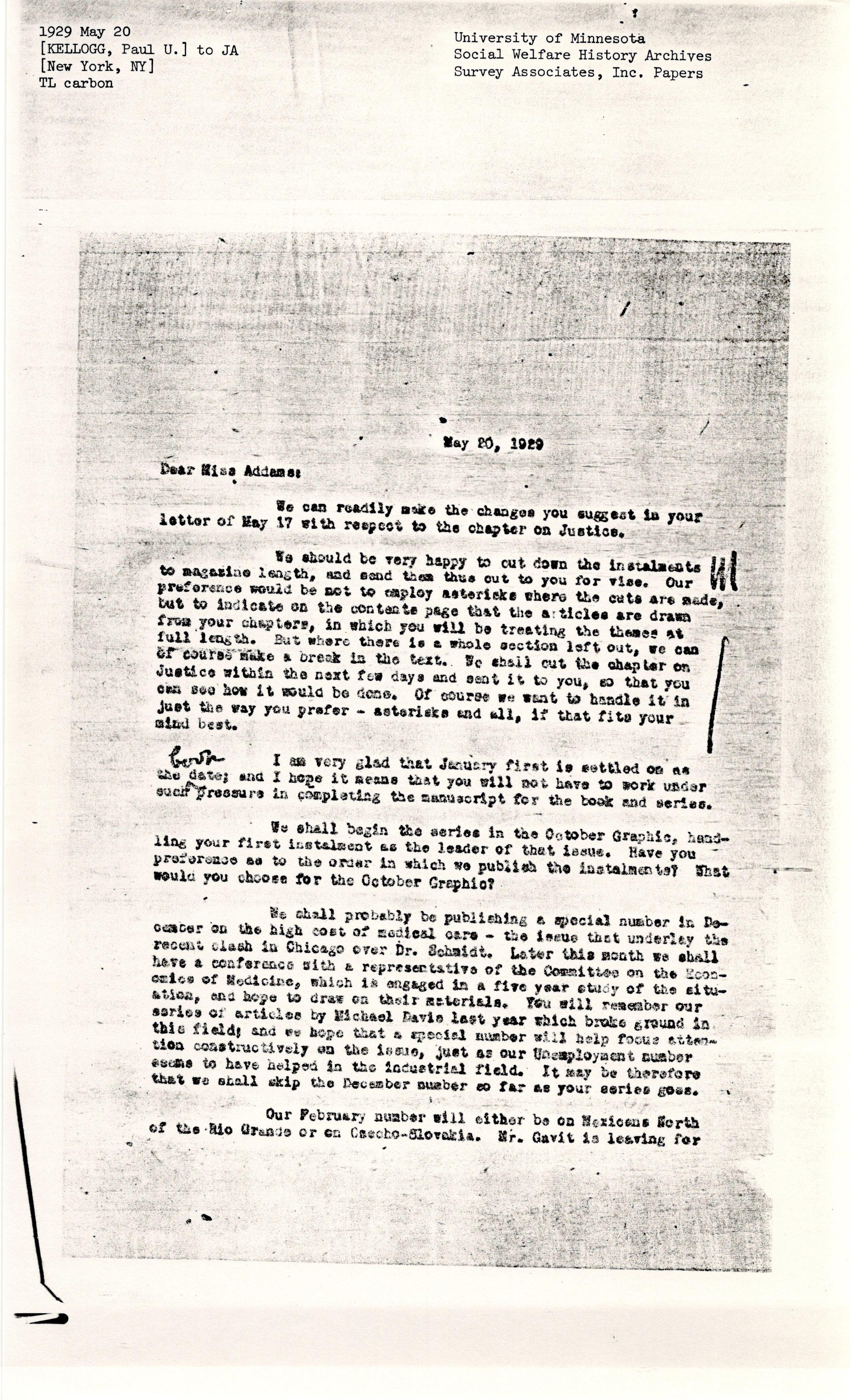 Paul Underwood Kellogg to Jane Addams, May 21, 1929