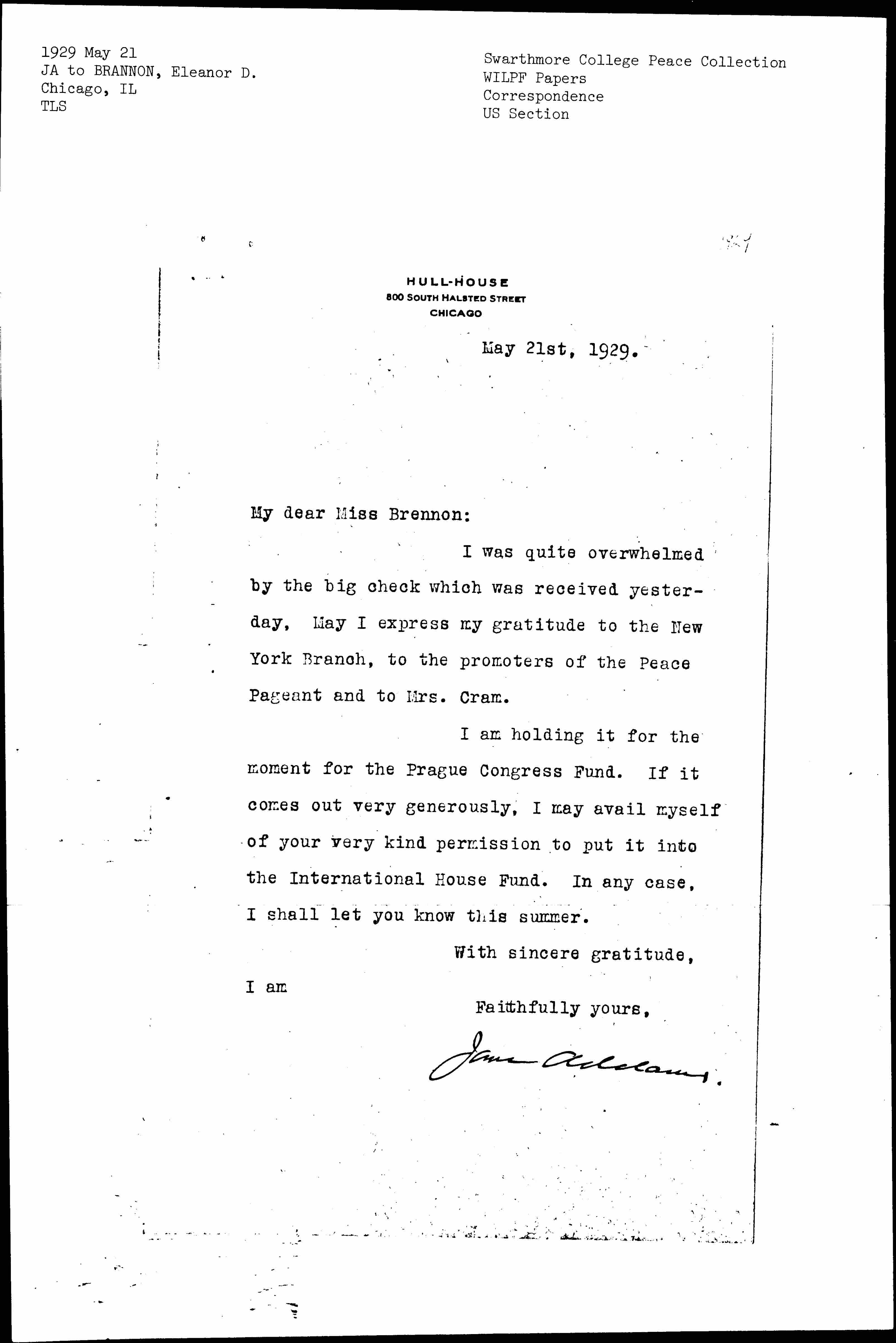 Jane Addams to Eleanor Doddridge Brannan, May 21, 1929
