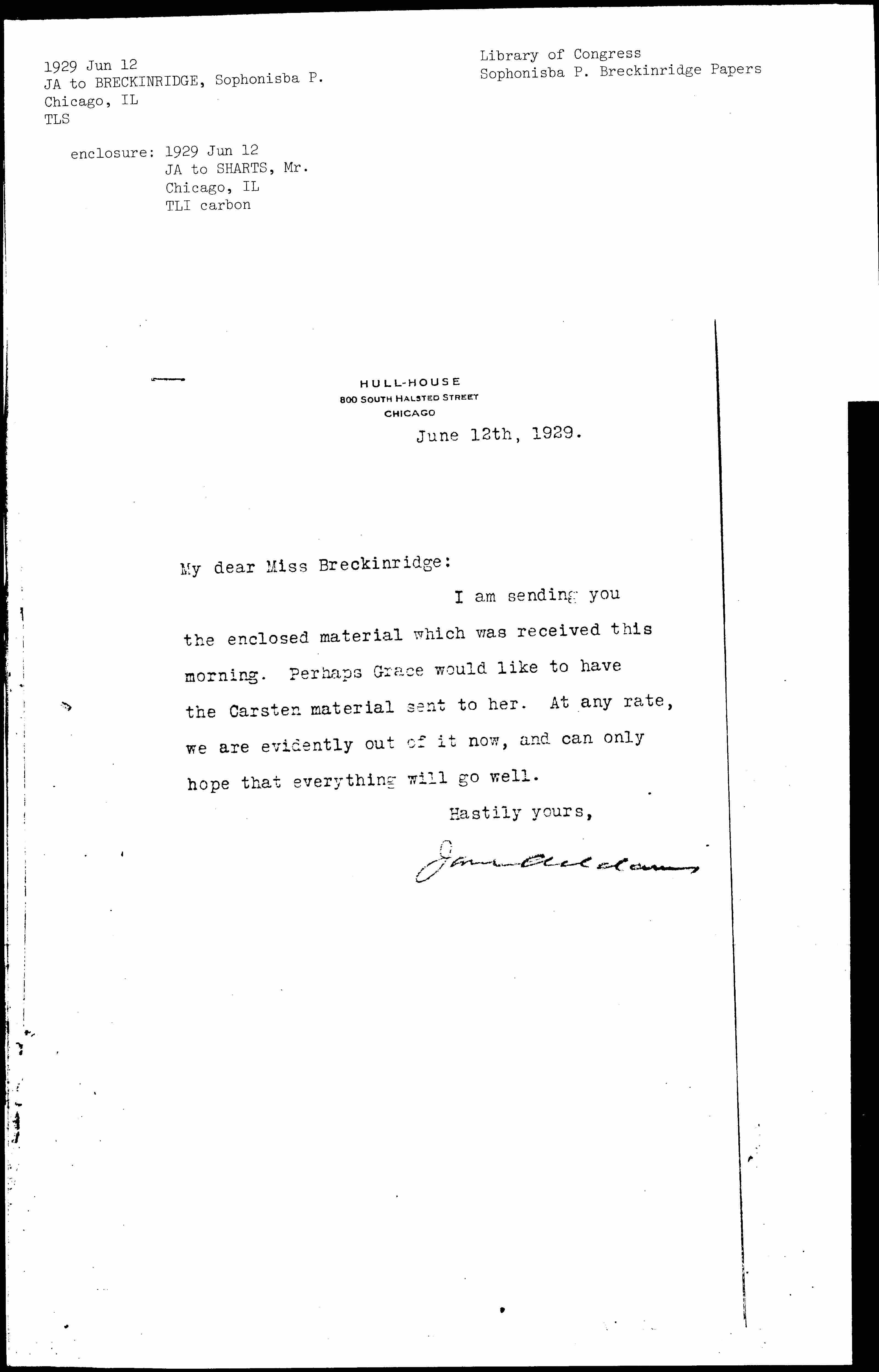 Jane Addams to Mr. Sharts, June 12, 1929
