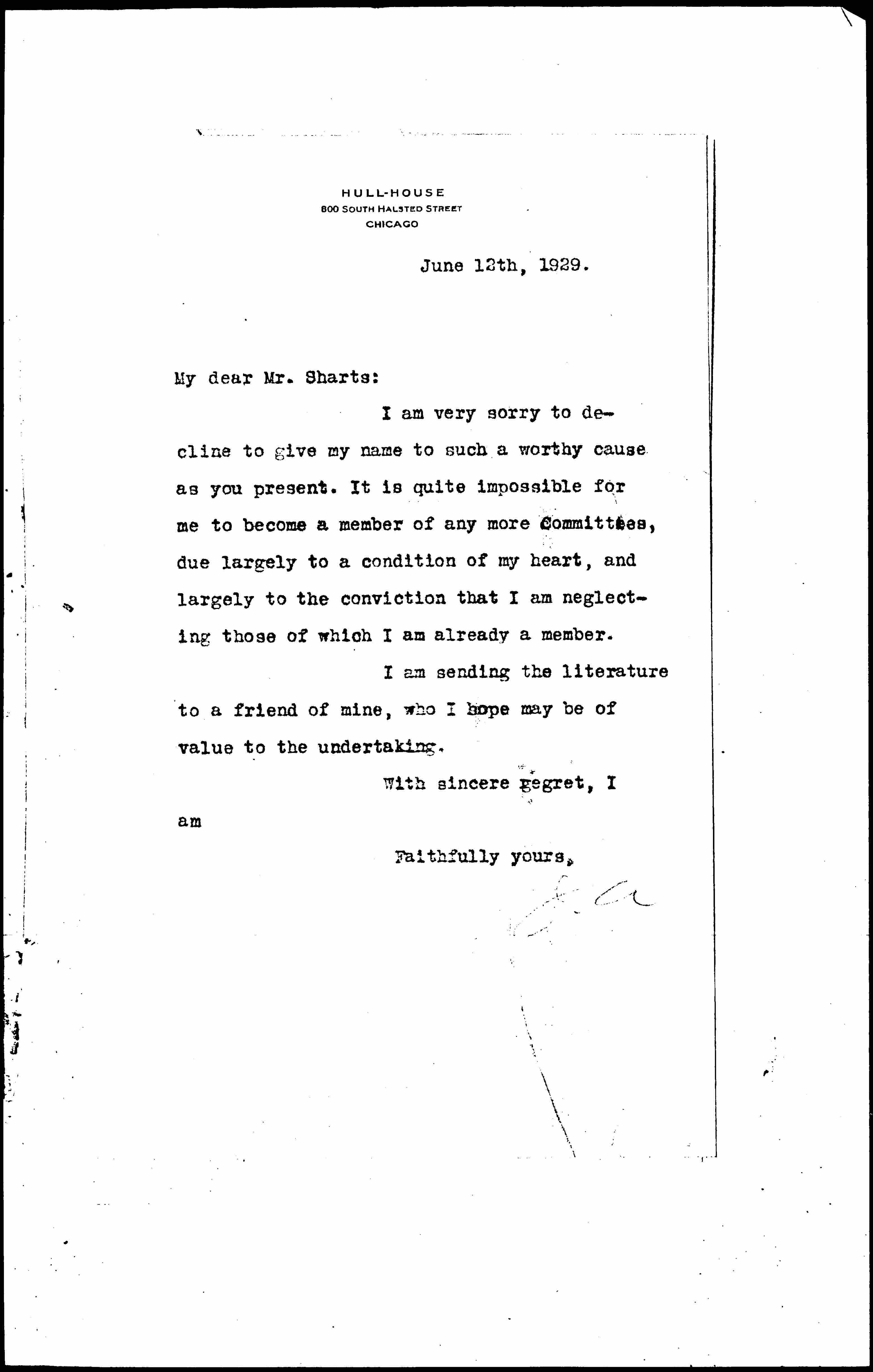 Jane Addams to Sophonisba P. Breckinridge, June 12, 1929