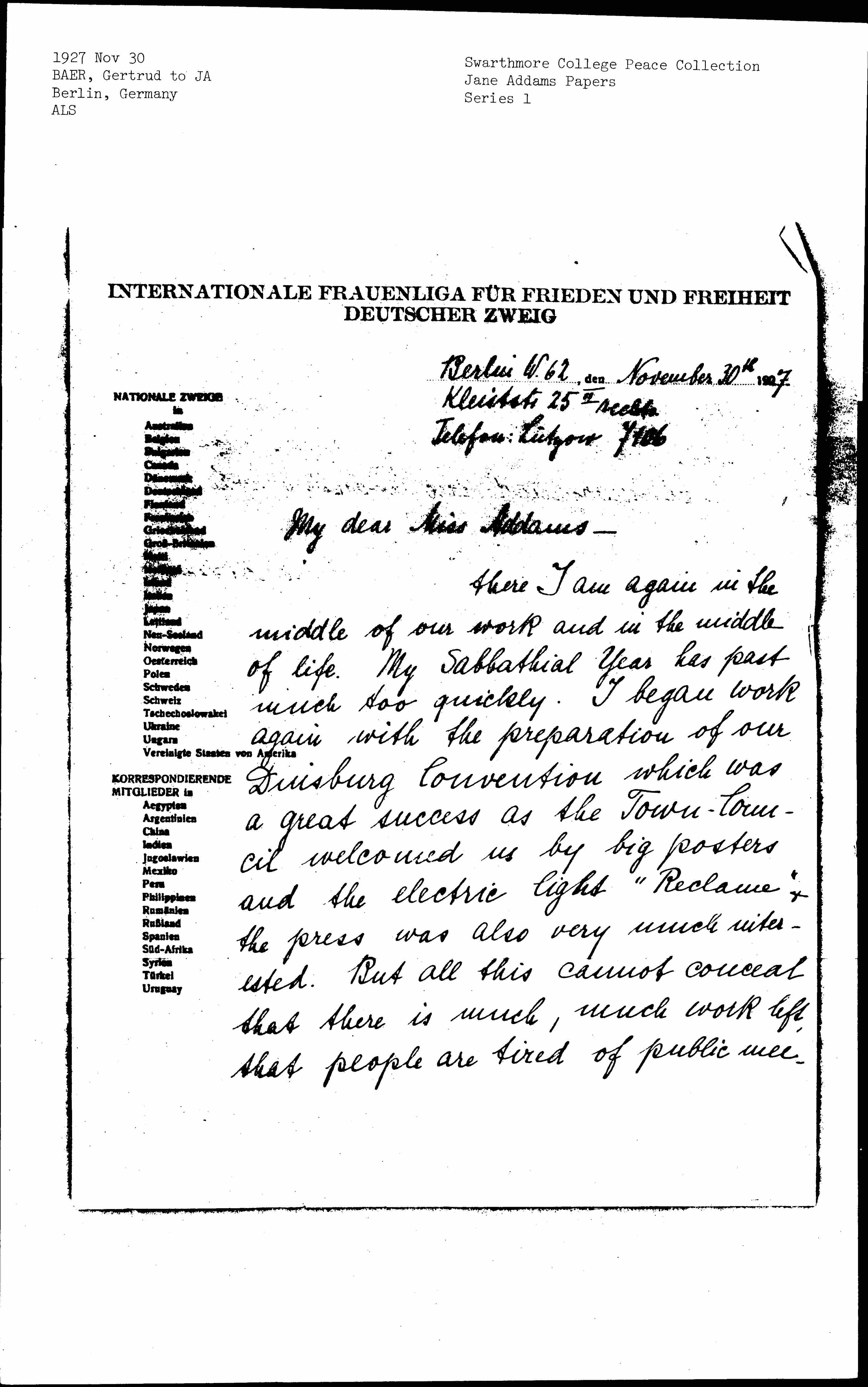 Gertrud Baer to Jane Addams, November 30, 1927