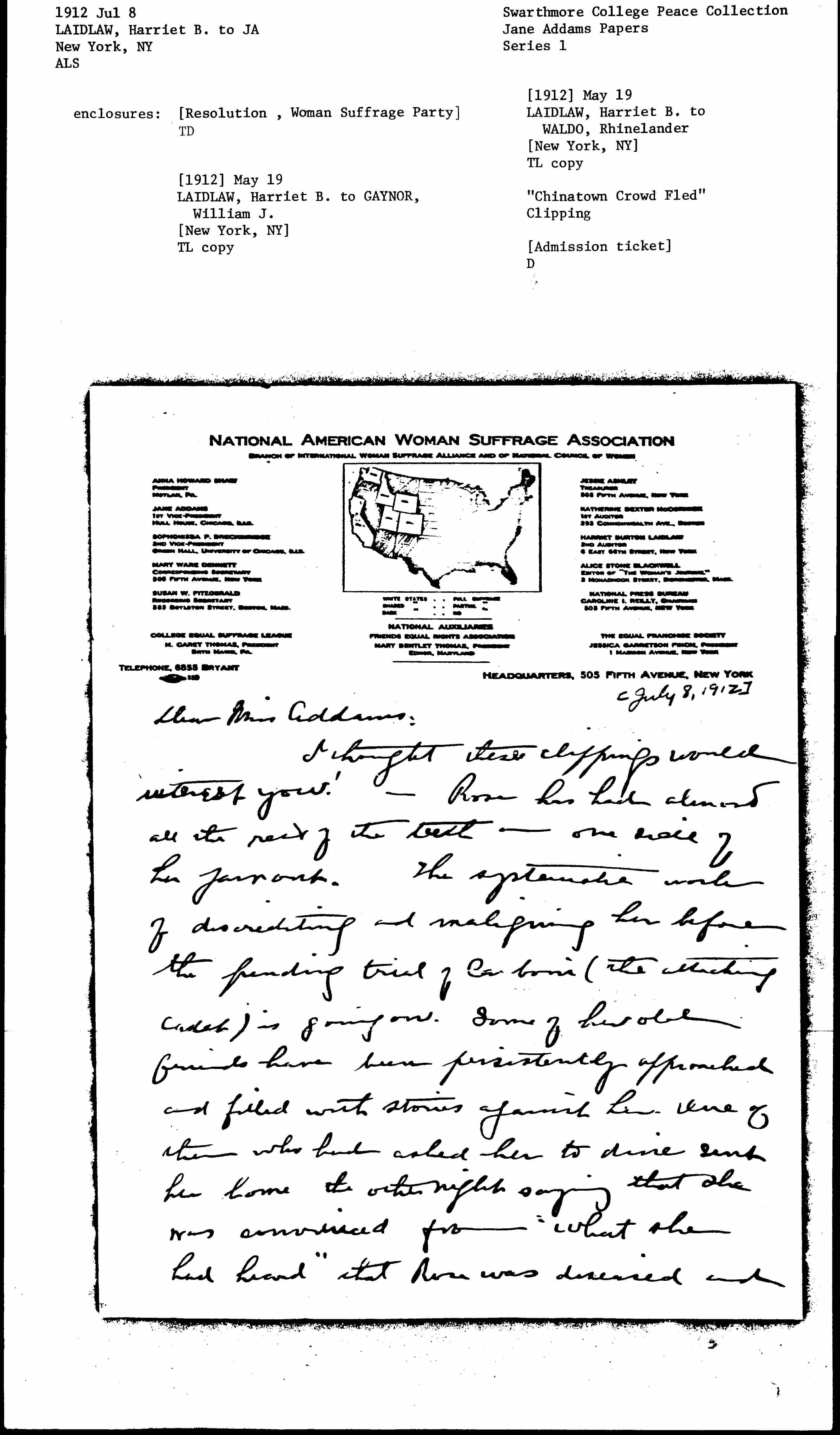 I thought these clippings would interest you! -- Rose has had almost all the rest of the teeth on the one side of her jaw out. The systematic work of discrediting and maligning her before the pending trial of Carboni (the attacking cadet) is going on. Some of her old friends have been persistently approached and filled with stories against her. One of them who had asked her to dine sent her home the other night saying that she was convinced from "what she had heard" that Rose was diseased and [page 2] that she had been suffering in health because she had "been getting rid of babies"!! -- Doctors are very reluctant now to "mix up" in her care because they fear to be called to court. However I have had my cousin Dr. Travell examine her at her request. He is now so indignant at all the accusations that he is willing to testify for her, go on the stand, -- anything as absolute evidence he asked the poor girl to go through the "Wasserman test" which reaches back 20 years. He took her to the board of health for this and she now has not only his but their certificate that [page 3] not one trace of any evidence of disease or immorality is found.