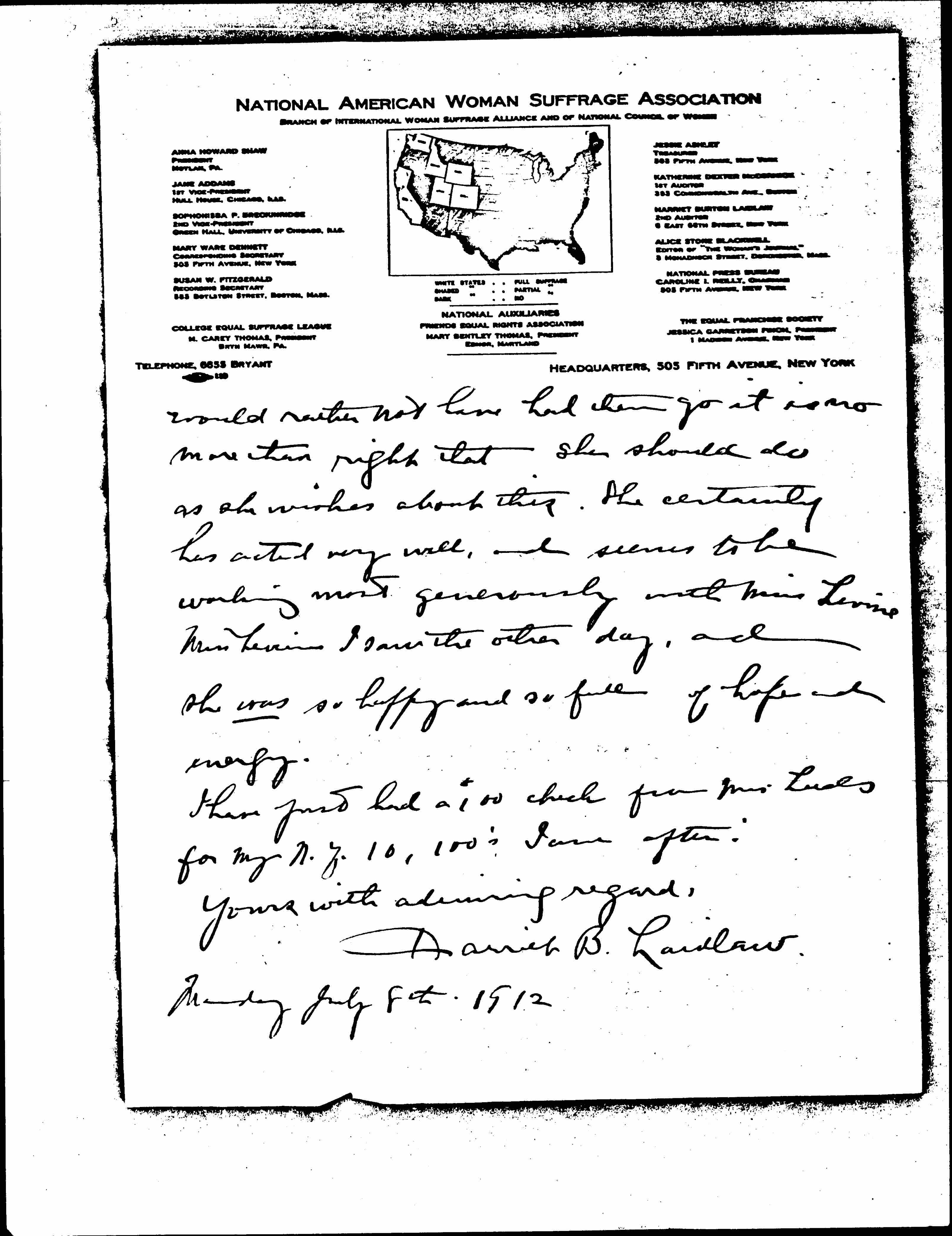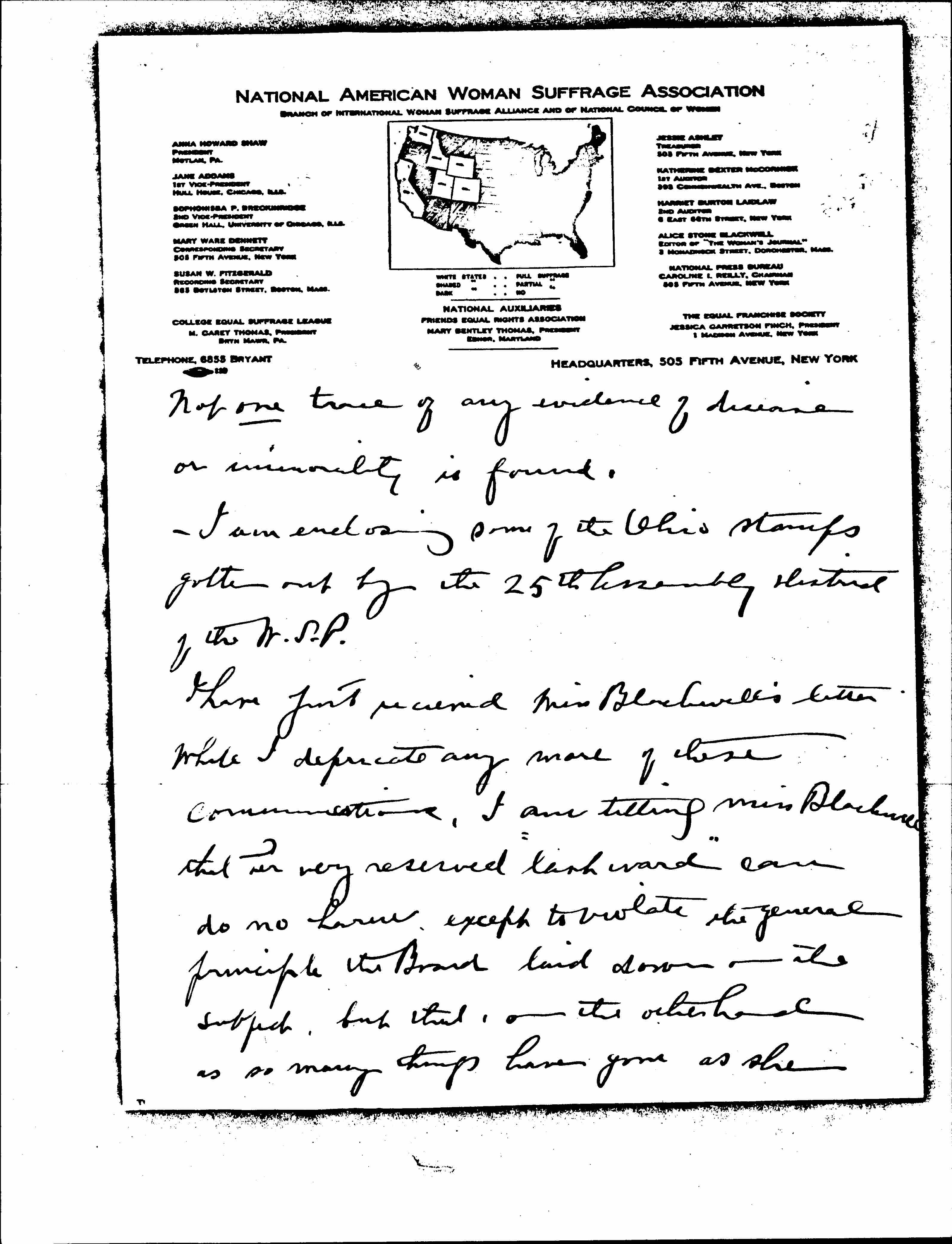 I have just received Miss Blackwell's letter while I deprecate any more of these communications, I am telling Miss Blackwell that her very reserved "last word" can do no harm except to violate the general principle the Board laid down on the subject, but that, on the other hand as so many things have gone as she [page 4] would rather not have had them go it is no more than right that she should do as she wishes about this. She certainly has acted very well, and seems to be working most generously with Miss Levine. Miss Levine I saw the other day, and she was so happy and so full of hope and energy.
