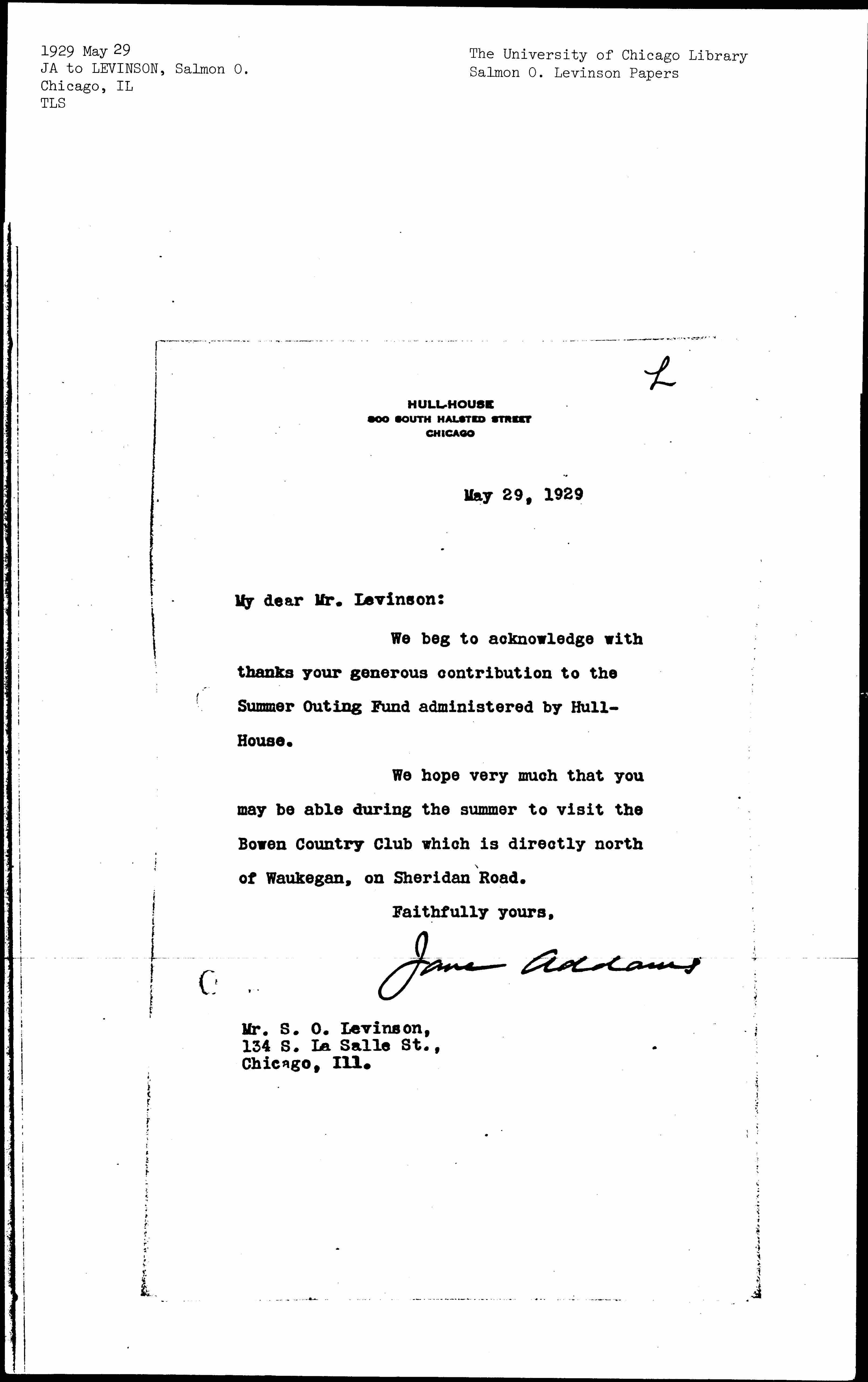 Jane Addams to Salmon Oliver Levinson, May 29, 1929