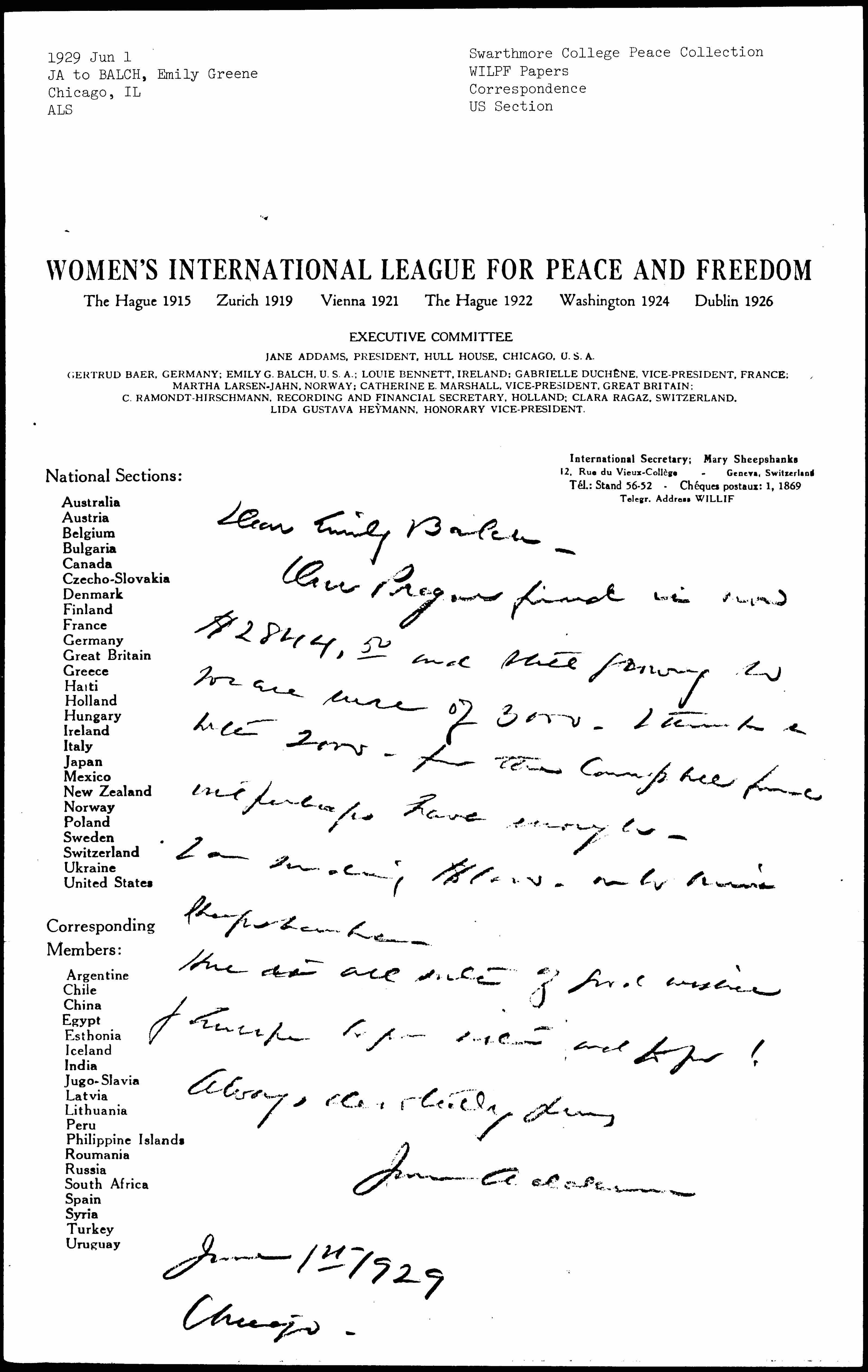 Jane Addams to Emily Greene Balch, June 1, 1929