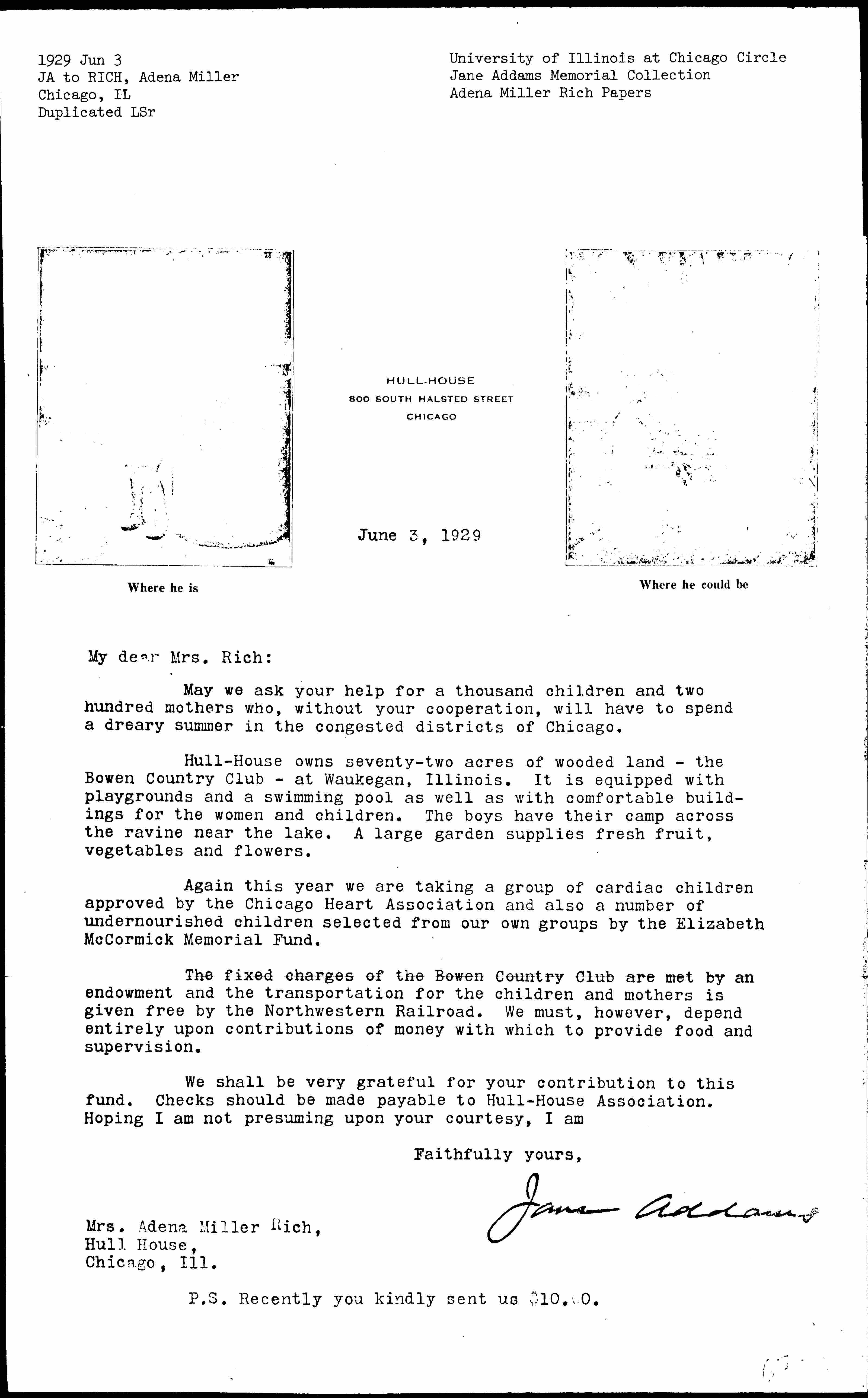 Jane Addams to Adena Miller Rich, June 3, 1929
