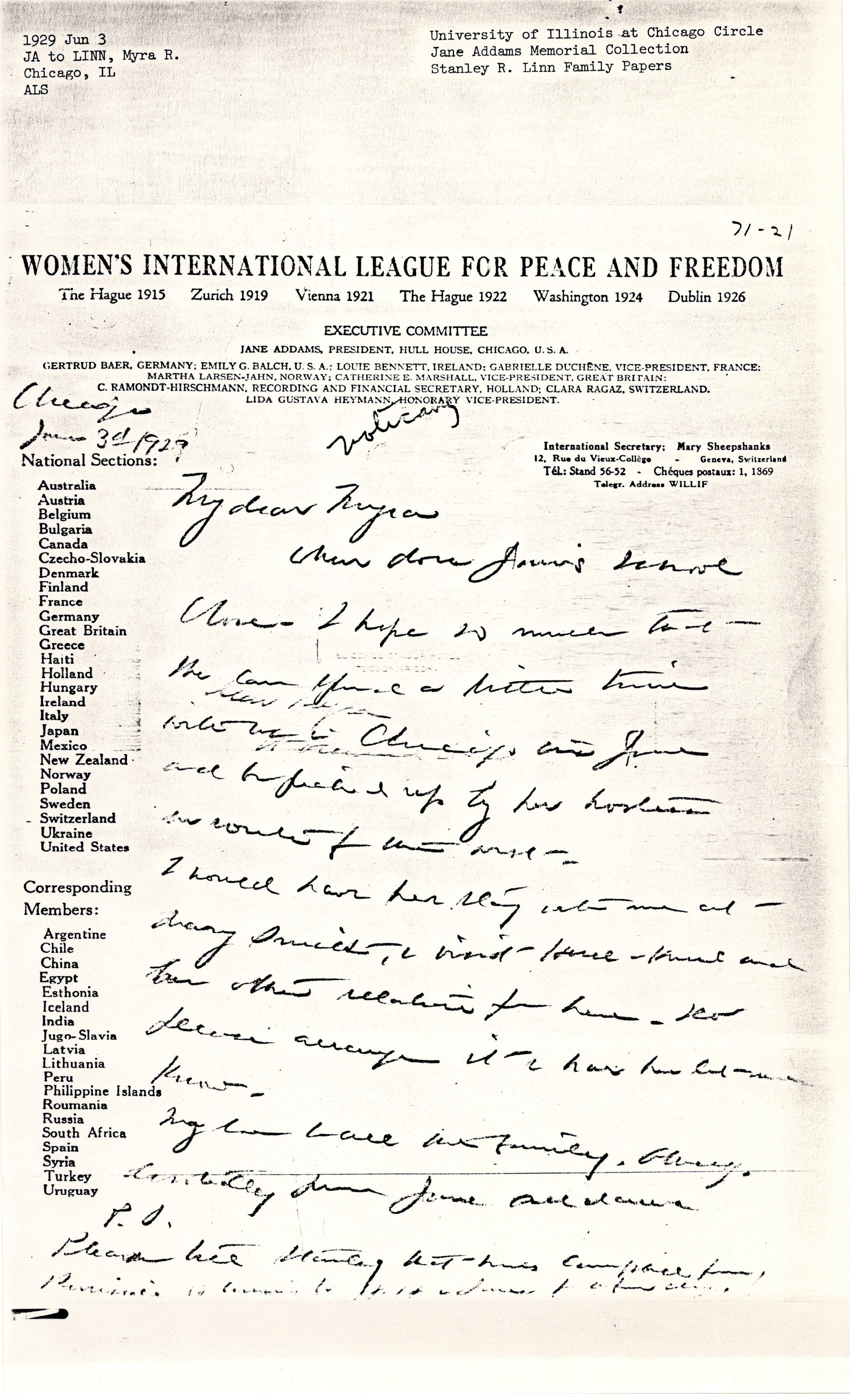 Jane Addams to Myra Reynolds Linn, June 3, 1929