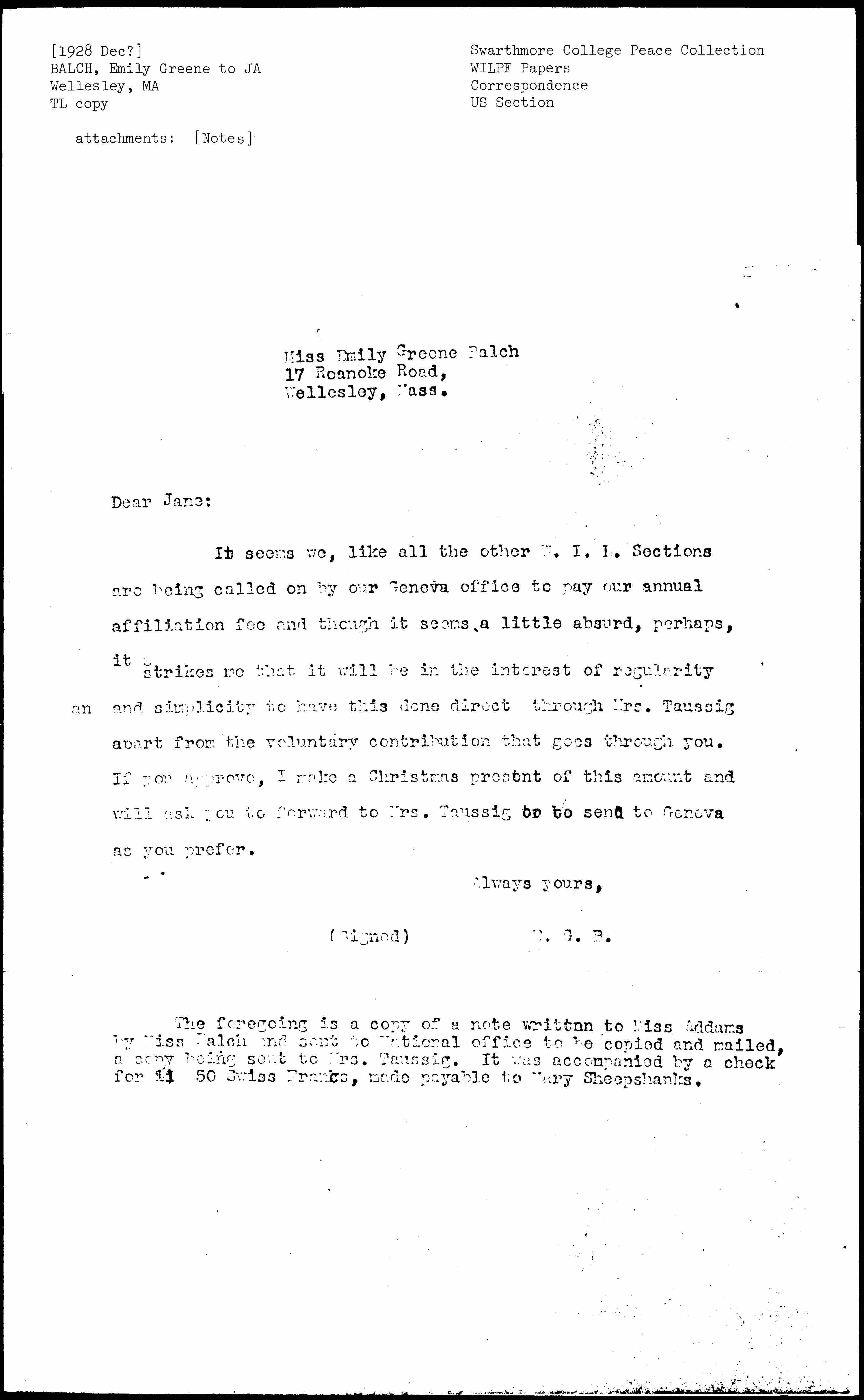 Emily Greene Balch to Jane Addams, December, 1928