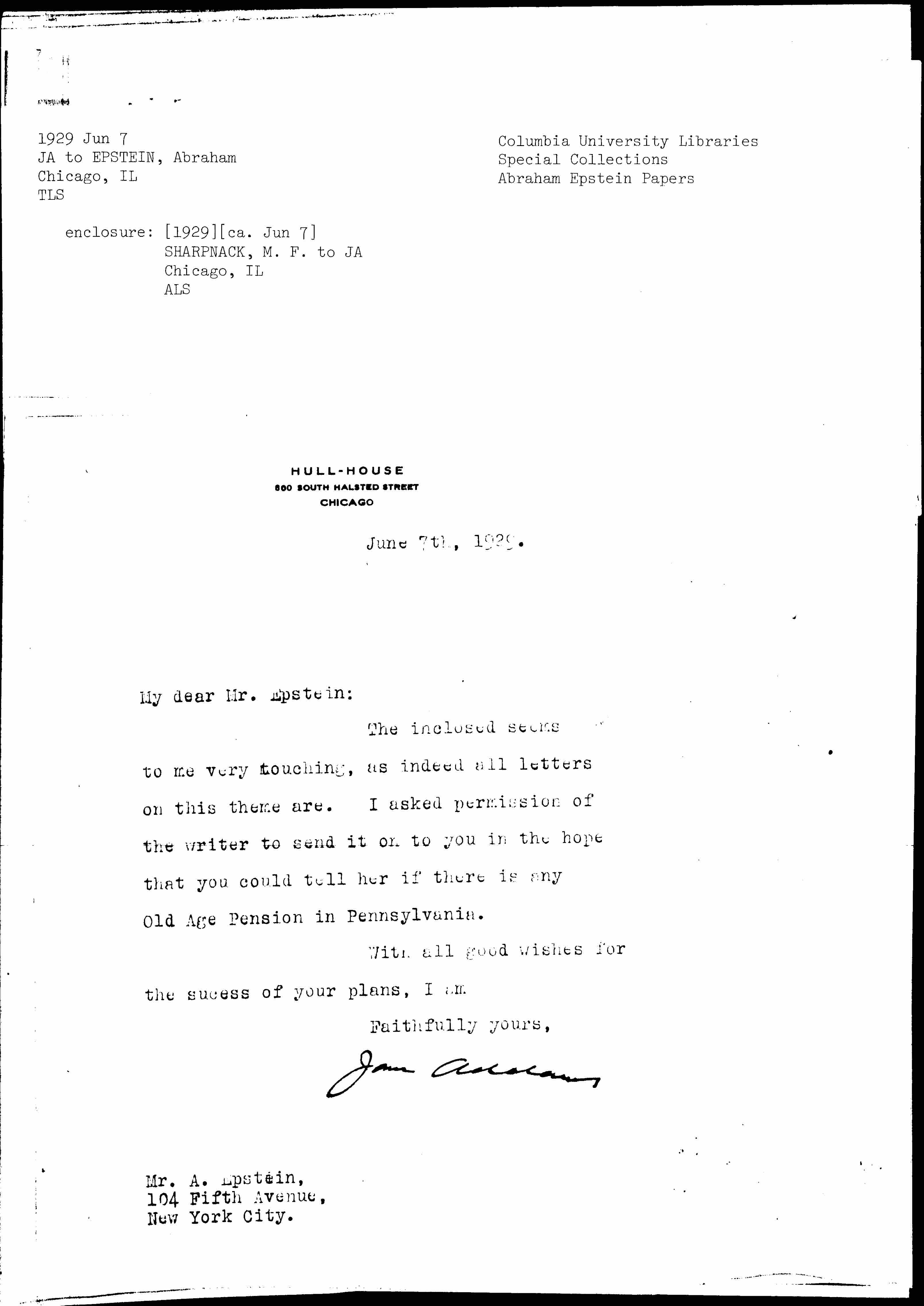 Jane Addams to Abraham Epstein, June 7, 1929