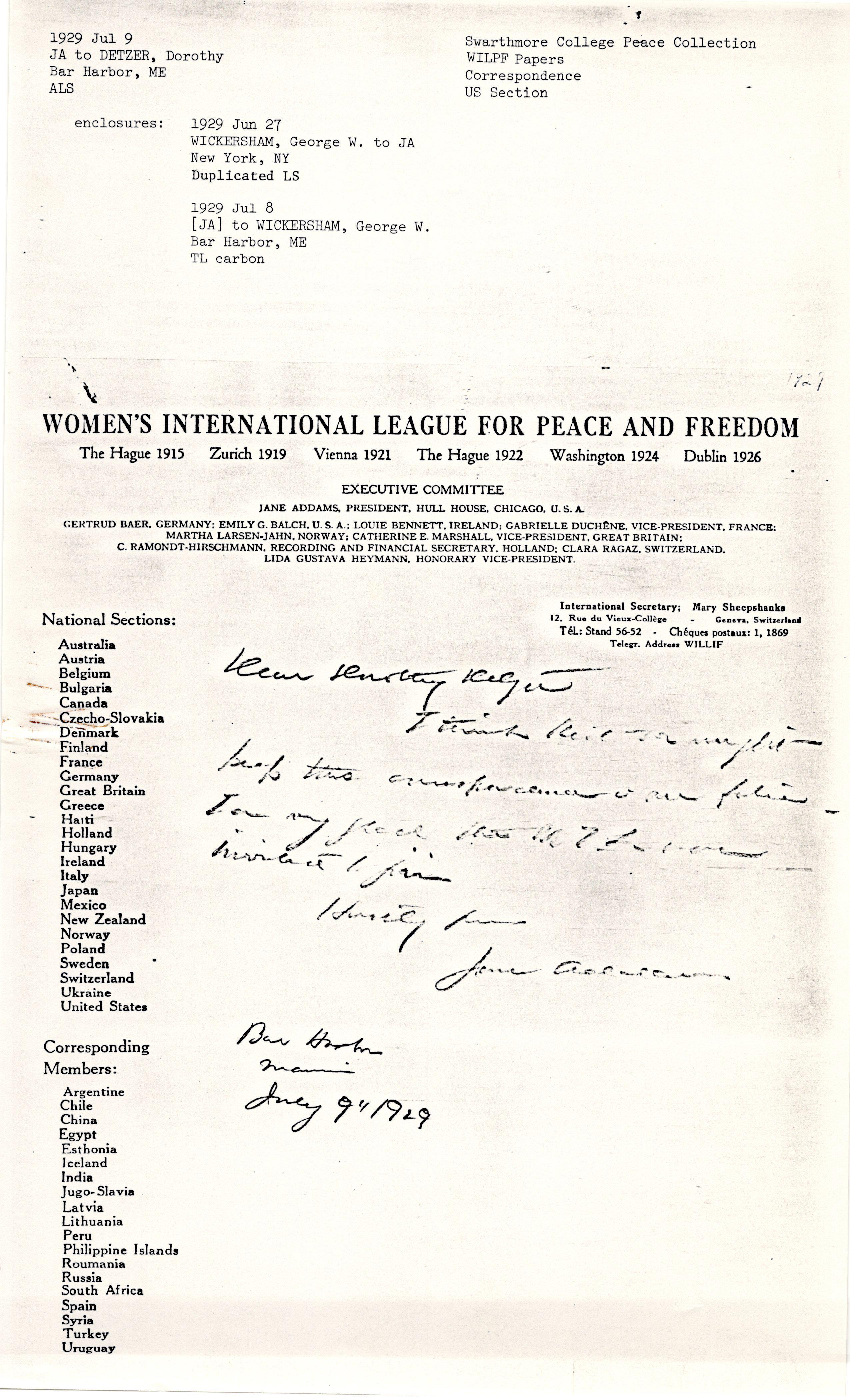 Jane Addams to Dorothy Detzer, July 9, 1929