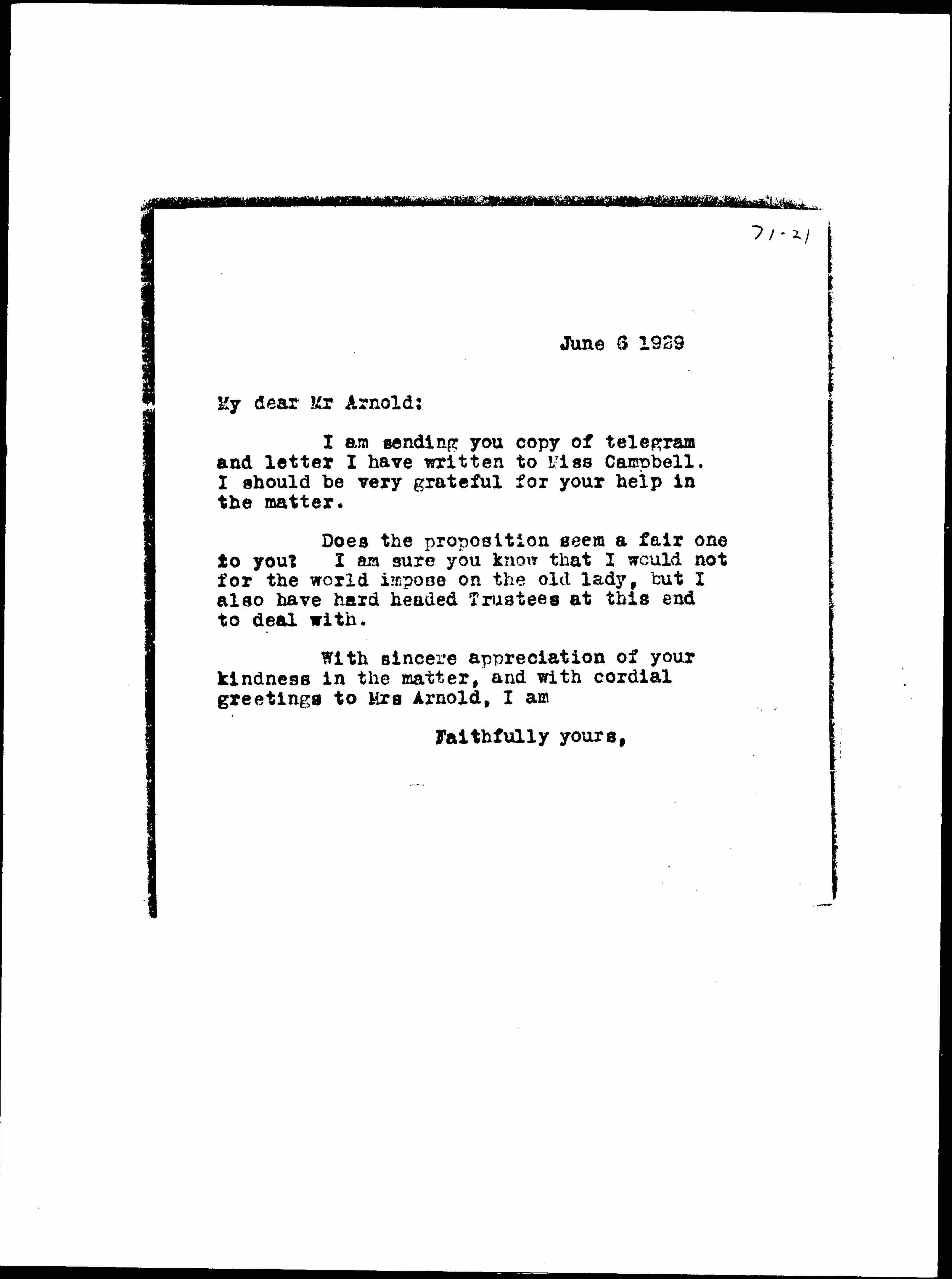 Jane Addams to Charles Columbus Arnold, June 6, 1929